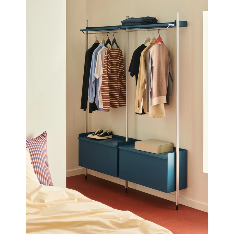Dessiné par les célèbres designers Ronan & Erwan Bouroullec, Pier System est un système de rangement multifonctionnel, développé pour s’adapter aux conditions vie moderne. Livré à plat et facile à monter, à reconfigurer et à recycler, Pier System est doté d’une construction simple et flexible, qui permet de ranger et d’organiser de nombreux types d’objets. Réalisé à partir d’aluminium et d’acier en utilisant le minimum de composants nécessaires à un système de rangement complet, Pier System est disponible dans différentes couleurs et de nombreuses configurations, qui peuvent être combinées ensemble. Les éléments des configurations peuvent être déplacés selon les besoins ou les envies, pour intégrer les fonctions que l’on souhaite. Edité par Hay, le système de rangement Pier trouve sa place dans toutes les pièces de la maison, que ce soit le salon, la chambre, l’entrée ou le bureau. Il est également adapté aux espaces contract. La configuration 1002 est dotée de deux étagères avec penderies et de deux rangements avec portes abattantes.