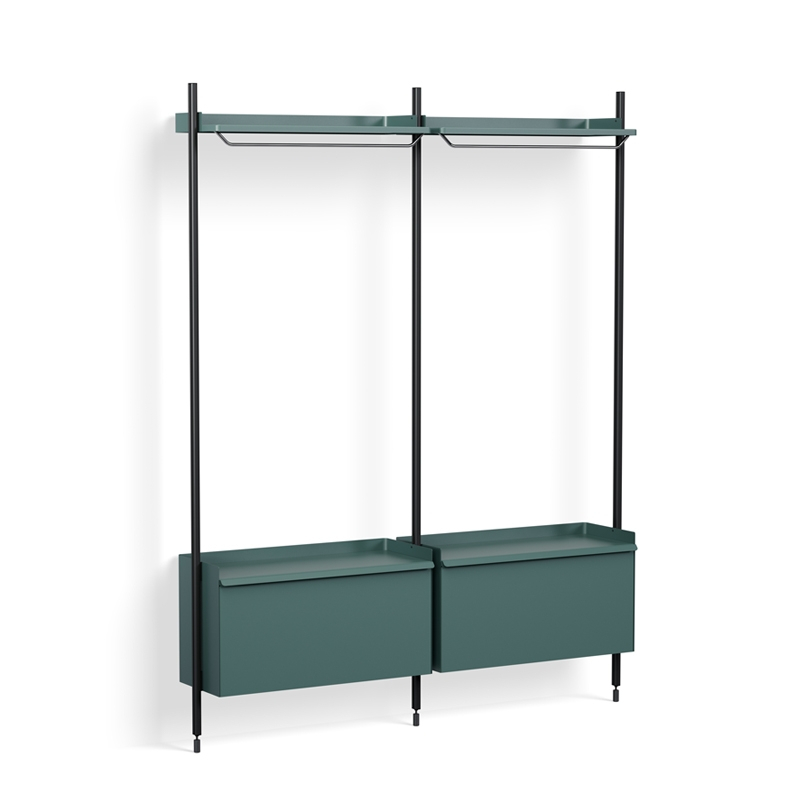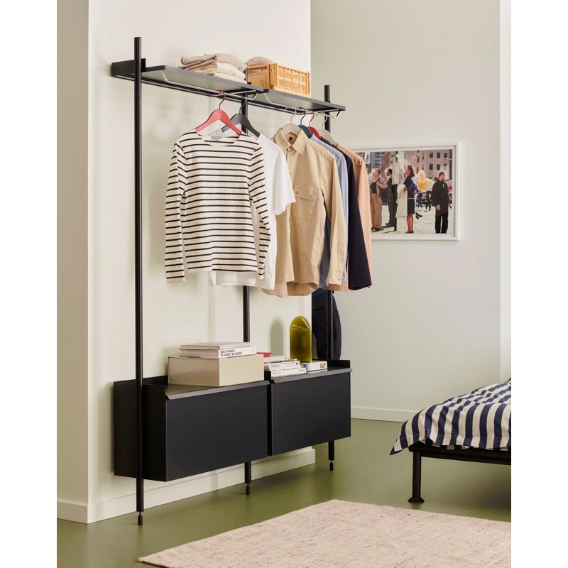 Dessiné par les célèbres designers Ronan & Erwan Bouroullec, Pier System est un système de rangement multifonctionnel, développé pour s’adapter aux conditions vie moderne. Livré à plat et facile à monter, à reconfigurer et à recycler, Pier System est doté d’une construction simple et flexible, qui permet de ranger et d’organiser de nombreux types d’objets. Réalisé à partir d’aluminium et d’acier en utilisant le minimum de composants nécessaires à un système de rangement complet, Pier System est disponible dans différentes couleurs et de nombreuses configurations, qui peuvent être combinées ensemble. Les éléments des configurations peuvent être déplacés selon les besoins ou les envies, pour intégrer les fonctions que l’on souhaite. Edité par Hay, le système de rangement Pier trouve sa place dans toutes les pièces de la maison, que ce soit le salon, la chambre, l’entrée ou le bureau. Il est également adapté aux espaces contract. La configuration 1002 est dotée de deux étagères avec penderies et de deux rangements avec portes abattantes.