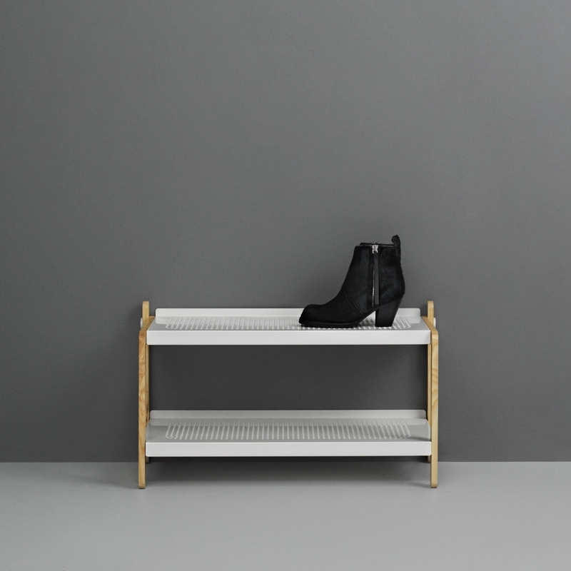 Dessiné par Simon Legald pour  Normann Copenhagen, Sko est un meuble de rangement pour chaussures, au style industriel et sobre. Réalisé en frêne et en acier perforé, c'est un petit meuble design qui va à l'essentiel, où les détails sont mis en valeurs, comme les vis et les boulons apparents ou encore les étagères perforées qui créent un jeu de lumière sur le sol. Sko trouve parfaitement  sa place dans l'entrée, la chambre, et partout où vous en avez besoin !