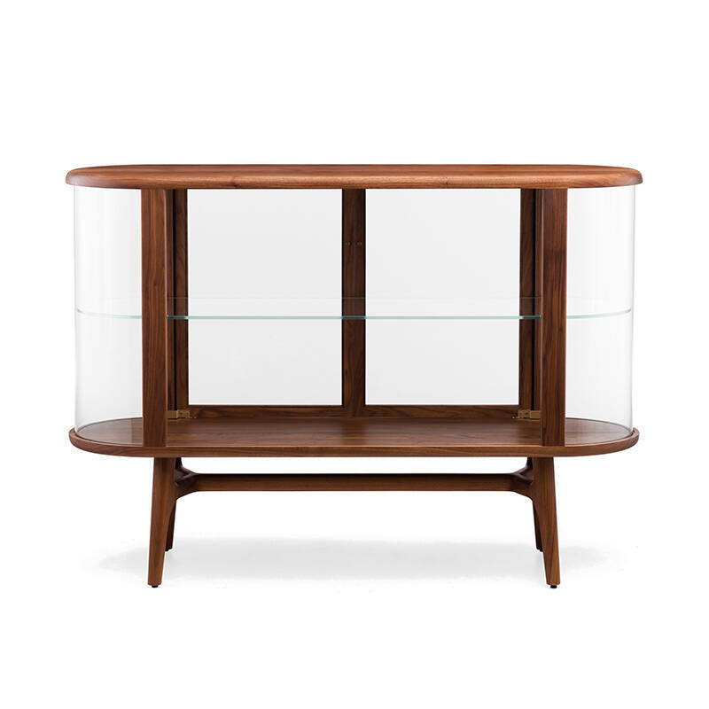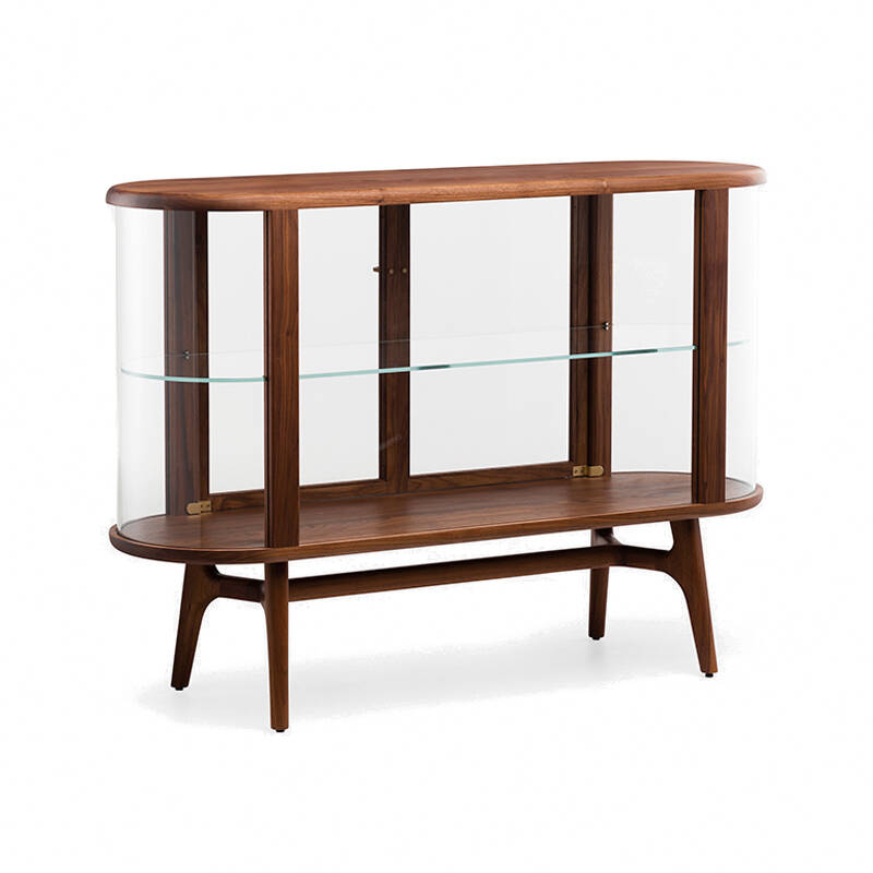Solo Vitrine, qui fait partie de la série Solo, reflète la même esthétique moderne et chaleureuse, la même fonctionnalité réfléchie, les bords incurvés doux et les beaux détails du reste de la série. Cette vitrine en verre présente un verre incurvé et des extrémités arrondies qui peuvent s'intégrer harmonieusement avec d'autres meubles. De grandes surfaces de verre transparent comme étagères créent un affichage impressionnant où les objets à l'intérieur sont le principal point culminant visuel. Une armature en bois massif simple et élégante encadre la structure, avec des détails tels que des poignées en laiton usiné et un cadre de pied mince.