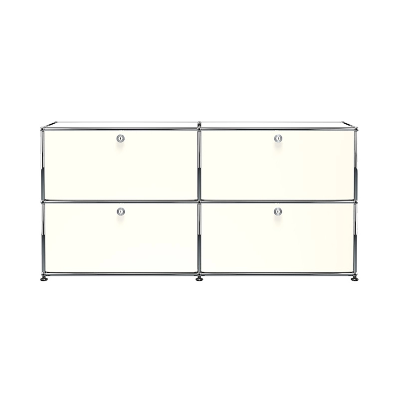 Le meuble Haller E2 est composé de quatre portes abattantes. Le meuble de rangement Haller E2 est doté d'une structure en acier chromé assemblé par des boules de connexion, habillée de panneaux d'acier thermolaqué et monté sur des patins réglables en hauteur.  Portes classiques ne nécessitant pas de clefs. (Sécurisées à la livraison, les portes se déverrouillent pour la première fois à l’aide d’une pièce ou d’une clef normale)
