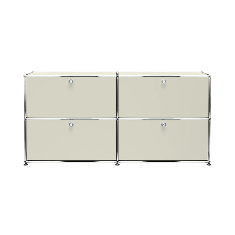 Le meuble Haller E2 est composé de quatre portes abattantes. Le meuble de rangement Haller E2 est doté d'une structure en acier chromé assemblé par des boules de connexion, habillée de panneaux d'acier thermolaqué et monté sur des patins réglables en hauteur.  Portes classiques ne nécessitant pas de clefs. (Sécurisées à la livraison, les portes se déverrouillent pour la première fois à l’aide d’une pièce ou d’une clef normale)