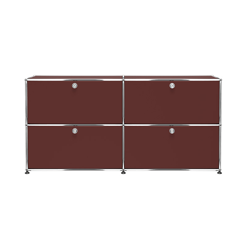 Le meuble Haller E2 est composé de quatre portes abattantes. Le meuble de rangement Haller E2 est doté d'une structure en acier chromé assemblé par des boules de connexion, habillée de panneaux d'acier thermolaqué et monté sur des patins réglables en hauteur.  Portes classiques ne nécessitant pas de clefs. (Sécurisées à la livraison, les portes se déverrouillent pour la première fois à l’aide d’une pièce ou d’une clef normale)
