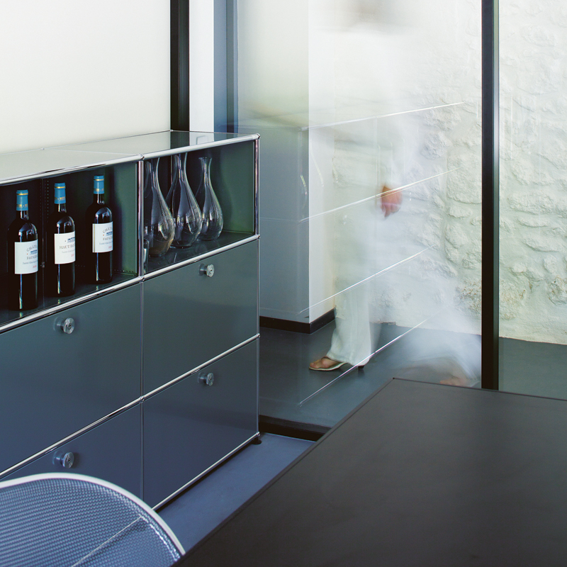 meuble Haller G3 est doté d'une structure en acier chromé assemblé par des boules de connexion, habillée de panneaux d'acier thermolaqué et monté sur des patins réglables en hauteur.