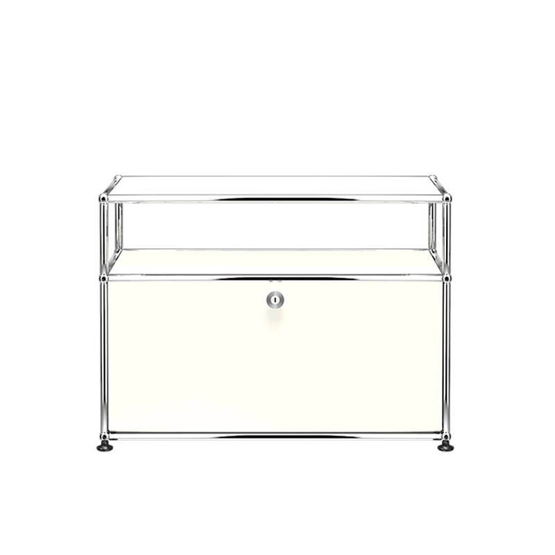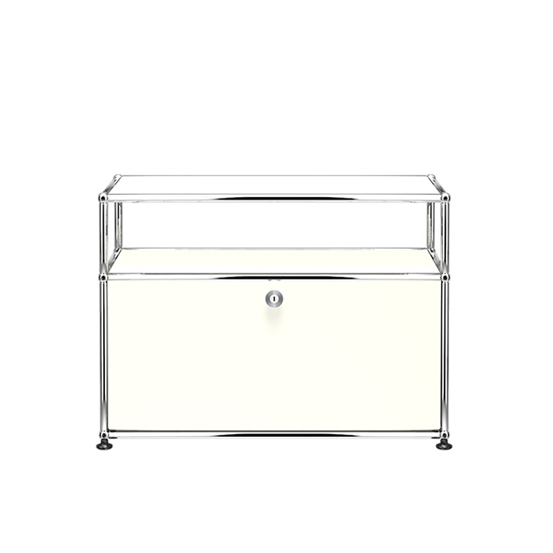 Le meuble Haller O1 est composé d'une porte abattante et d'un module ouvert. Le meuble Haller O1 est doté d'une structure en acier chromé assemblé par des boules de connexion, habillée de panneaux d'acier thermolaqué et monté sur des patins réglables en hauteur.  Porte classiques ne nécessitant pas de clefs. (Sécurisée à la livraison, la porte se déverrouille pour la première fois à l’aide d’une pièce ou d’une clef normale)
