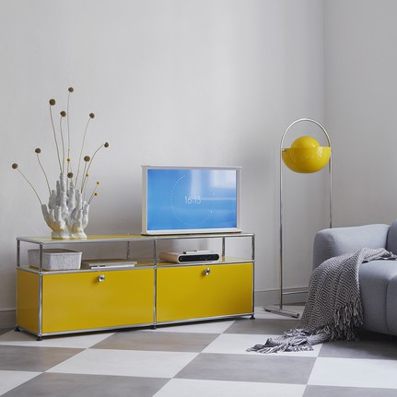 Le meuble Haller O2 est composé de deux portes abattantes et deux modules ouverts. Le meuble Haller O2 est doté d'une structure en acier chromé assemblé par des boules de connexion, habillée de panneaux d'acier thermolaqué et monté sur des patins réglables en hauteur.  Portes classiques ne nécessitant pas de clefs. (Sécurisées à la livraison, les portes se déverrouillent pour la première fois à l’aide d’une pièce ou d’une clef normale)