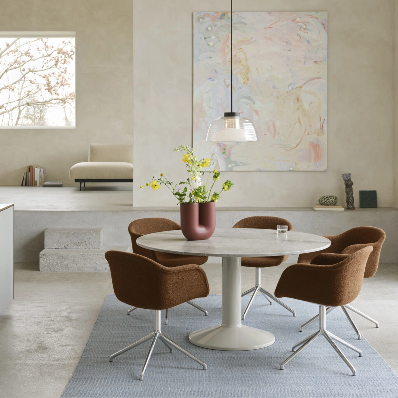 La table Midst de Muuto incarne l’équilibre entre sobriété et caractère. Pensée comme un point de rassemblement, elle se distingue par son pied central conique qui lui confère une présence sculpturale, tout en libérant l’espace autour de l’assise. Sa surface circulaire invite à la convivialité, créant une atmosphère fluide où chacun trouve sa place sans hiérarchie. Réalisée dans des matériaux robustes et raffinés, la Midst marie la pureté des lignes scandinaves avec une expression contemporaine forte. Son design, à la fois discret et affirmé, en fait une pièce qui s’intègre aussi bien dans un intérieur domestique que dans un cadre professionnel ou collectif. Plus qu’une simple table, la Midst de Muuto devient un centre de gravité dans l’espace : un lieu de partage, de discussion et de connexion, fidèle à l’idée que le mobilier doit être à la fois fonctionnel et porteur d’émotions.