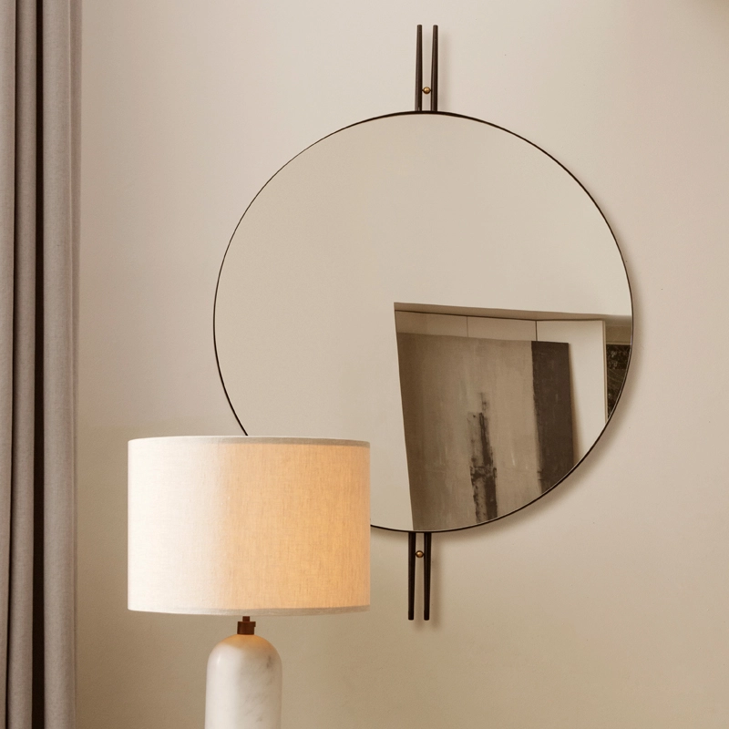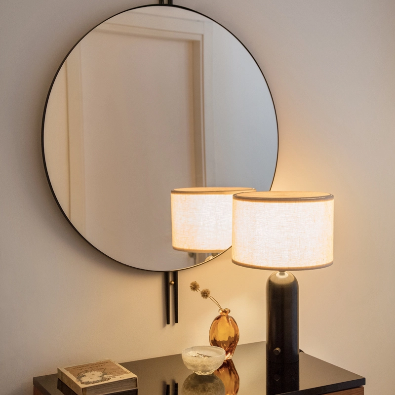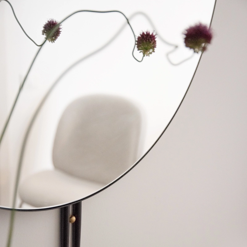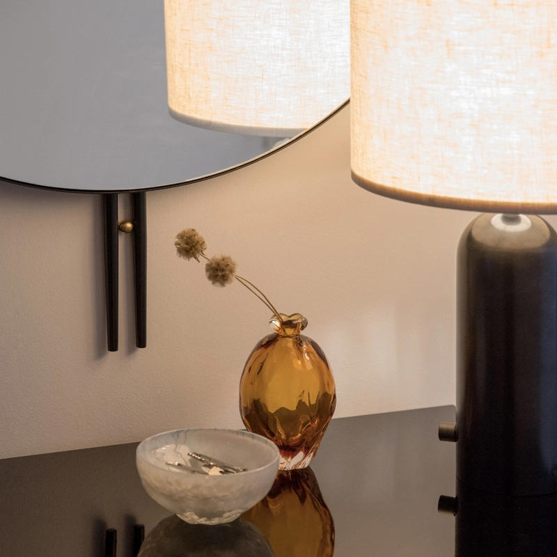 La collection IOI, dessinée par le duo GamFratesi pour Gubi, est une célébration de la matérialité italienne, avec l’utilisation du laiton et du marbre Emperador et Carrara. S’appuyant sur des références géométriques Art Déco avec un langage de design contemporain, le miroir et les tables de la collection IOI ont en commun une structure composée de fines tiges en métal reliées par une sphère en laiton, reflétant la forme des lettres que l’on retrouve dans le nom « IOI ». Les sphères en laiton sont à la fois fonctionnelles, reliant les deux tiges en métal et renforçant la construction, mais elles sont aussi la signature du design, accentuant la matérialité et la légèreté de la collection. Le miroir mural IOI est parfait au-dessus d’une console dans un intérieur, mais peut être aussi un parti pris sculptural dans l’entrée d’un espace collectif. Comme beaucoup des créations du duo GamFratesi, la collection IOI allie des idées opposées : le classique et le contemporain, le sobre et l’expressif, le manufacturé et l’unique. Ces juxtapositions, ainsi que le désir constant de défier le statu quo tout en respectant ce qui a la tradition, sont incarnés dans les tables basses et le miroir mural IOI.