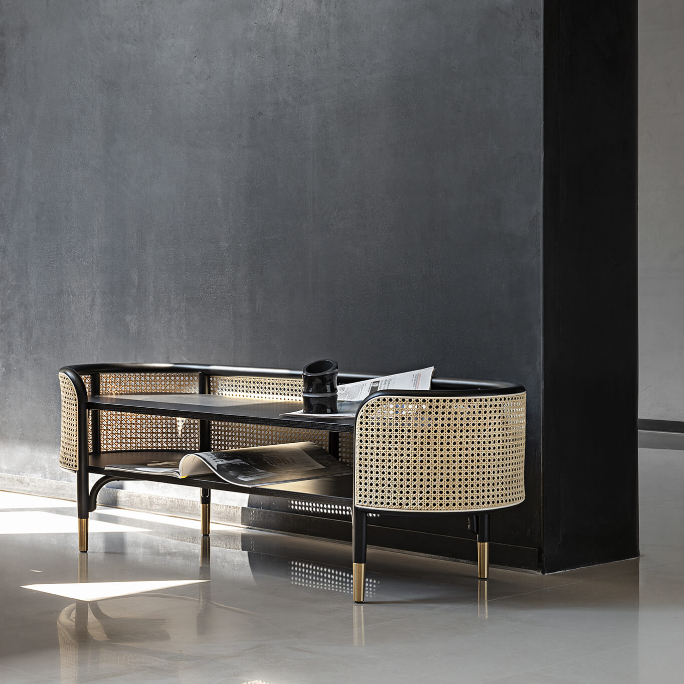 Visiblement léger et délicat, en forme d’ellipse, il exprime son âme par le soin du détail : de sa séduisante coque en paille de Vienne dissimulant la surface d’appui inférieure et se reliant à l’assise aux pieds avec bouts en laiton. La structure est fabriquée en bois de hêtre cintré et la surface d’appui en frêne avec laquage à pores ouverts.