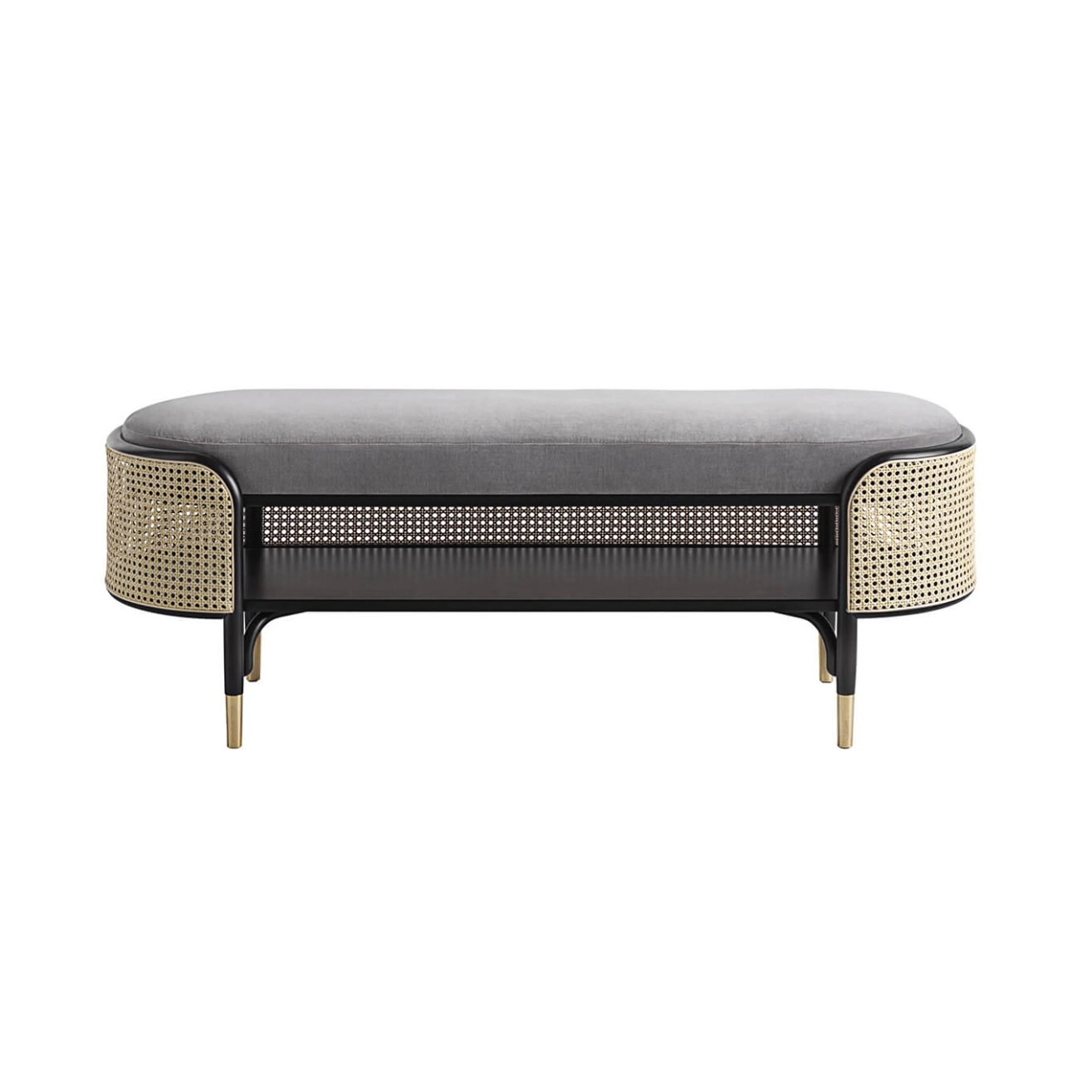 Hêtre cintré laqué, inserts en paille de Vienne, plateaux plaqué frêne teinté à pores ouverts, coussin déhoussable revêtement velours, pieds en laiton