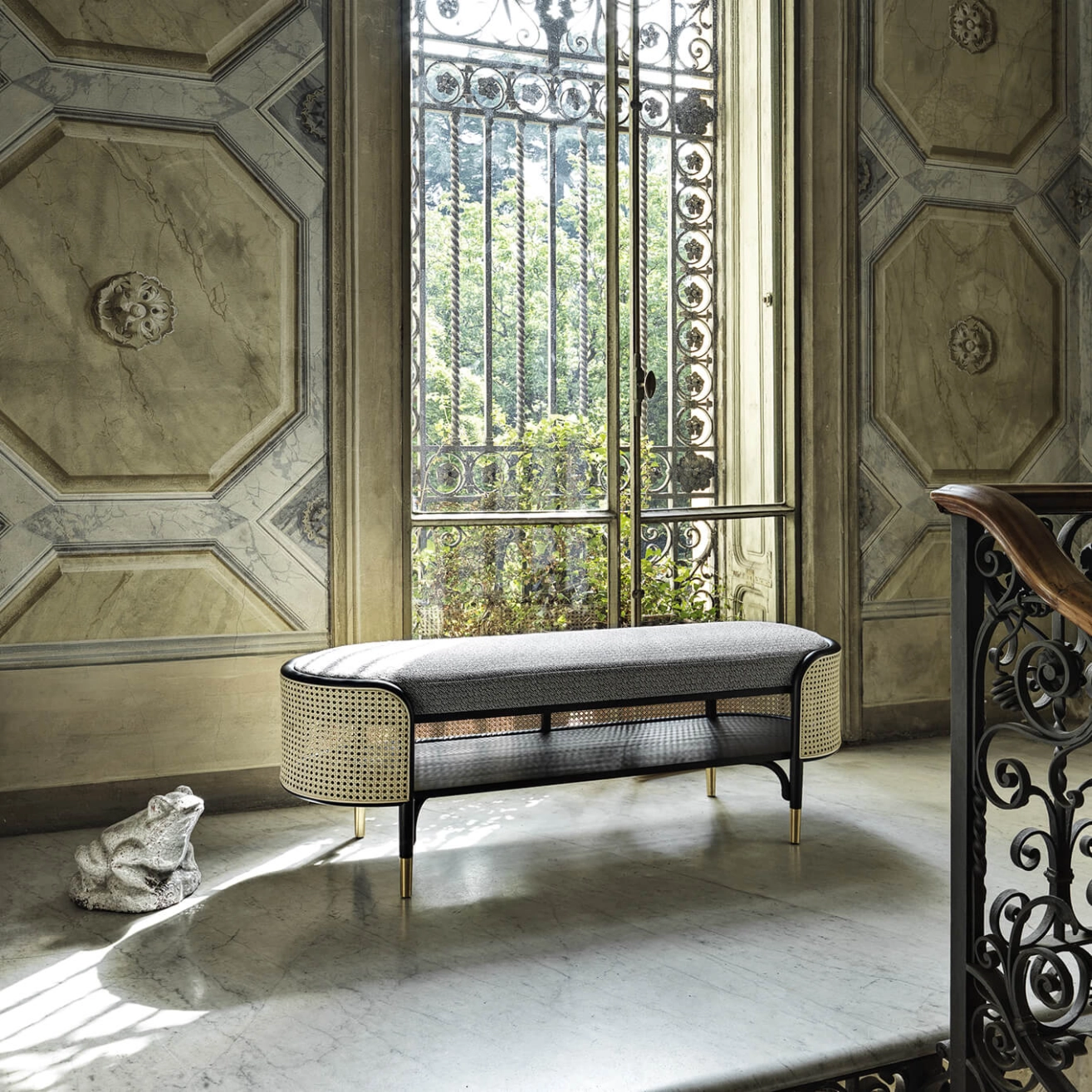 Avec ses dimensions harmonieuses, le banc Mos, signé GamFratesi, est un élément qui exerce une fonction double : assise et module de rangement avec surface ajourée. La version contemporaine d’un meuble du passé, fait pour la zone de sommeil, parfait au pied du lit, et avec son caractère discret et raffiné, également remarquable dans une entrée ou dans le salon. Visiblement léger et délicat, en forme d’ellipse, il exprime son âme par le soin du détail : de sa séduisante coque en paille de Vienne dissimulant la surface d’appui inférieure et se reliant à l’assise aux pieds avec bouts en laiton. La structure est fabriquée en bois de hêtre cintré et la surface d’appui en frêne avec laquage à pores ouverts.