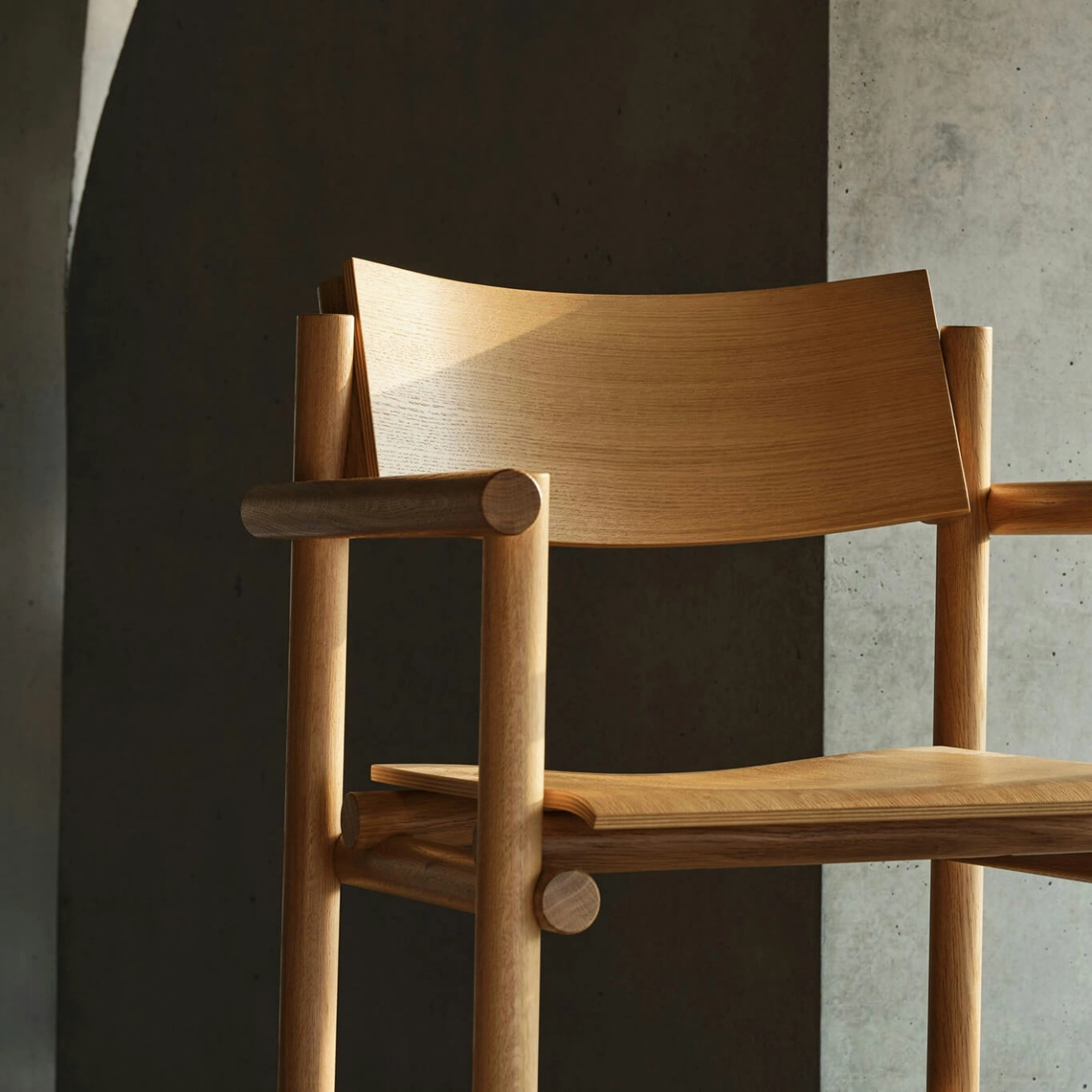 Jonathan Muecke aborde aussi bien le mobilier que la sculpture avec la volonté de révéler et d’exprimer la logique inhérente à ses matériaux. La chaise Muecke Wood Chair est née de son désir de célébrer toutes les qualités du bois, y compris les coupes en bout, souvent dissimulées. Pour cela, il façonne le bois en tourillons arrondis et met au point une méthode d’assemblage qui les relie là où ils se croisent, grâce à un tenon flottant. « On peut comprendre la pièce de bois, » explique-t-il. « Elle n’est pas déguisée. Elle est là pour être comprise encore et encore. » Cette approche met en valeur la beauté naturelle du matériau, tout en révélant une structure claire et cohérente. Le système d’assemblage distinctif se répète dans l’ensemble de la collection, baptisée Muecke Wood Collection.