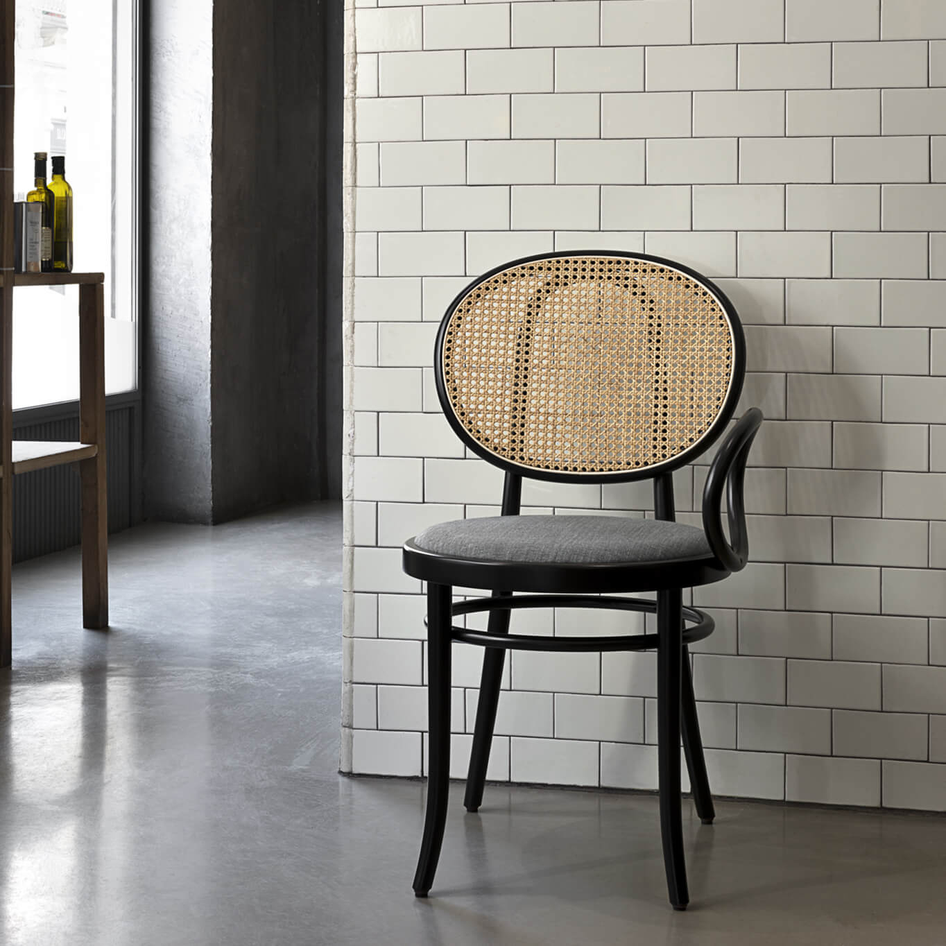 Hêtre cintré laqué, assise rembourrée, revêtement tissu Coda, dossier en paille de Vienne