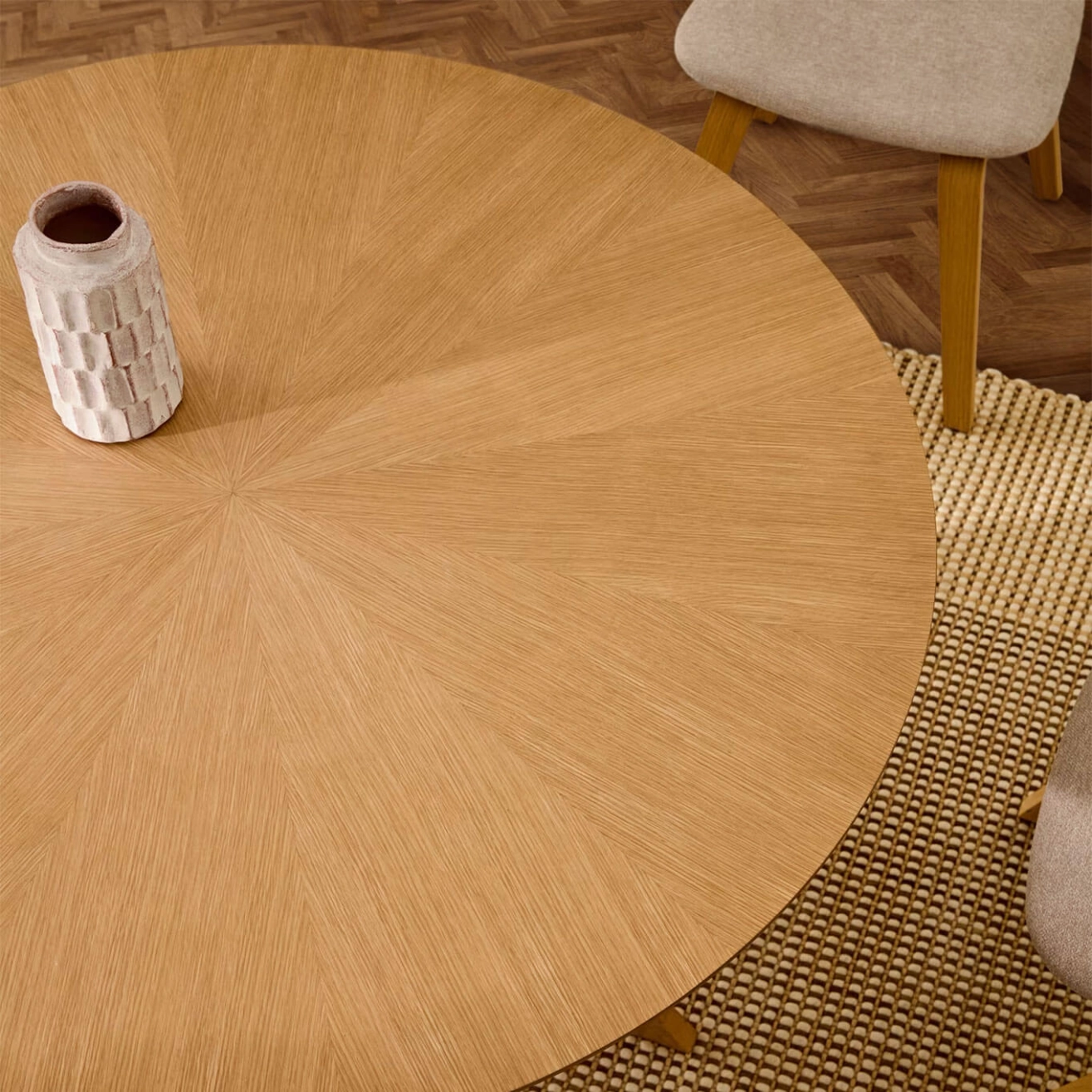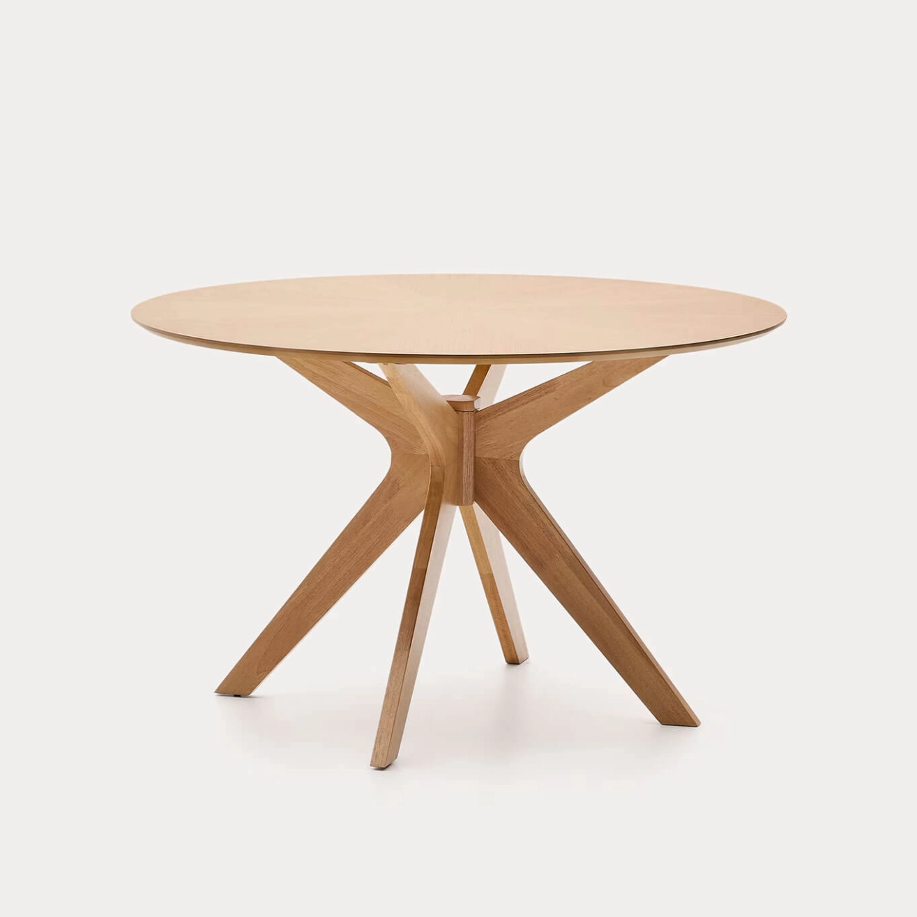 Naanim est une table de salle à manger ronde avec un plateau en placage de chêne naturel et des pieds en bois massif d’hévéa finition chêne, conçue par Kave Home. Grâce à sa forme circulaire et à la disposition étudiée de ses pieds, elle s’adapte parfaitement aux espaces réduits ou allongés, offrant confort et fluidité autour de la table. Chaque table Naanim est unique, fabriquée à partir d’un placage de chêne naturel dont les veines convergent en une forme étoilée, créant un effet visuel élégant et distinctif. Ses pieds en bois massif sont dotés de patins réglables pour compenser les irrégularités du sol et garantir une stabilité optimale au quotidien. Disponible en plusieurs dimensions et finitions, Naanim allie savoir-faire, esthétique naturelle et fonctionnalité, apportant chaleur et caractère à tout espace repas.