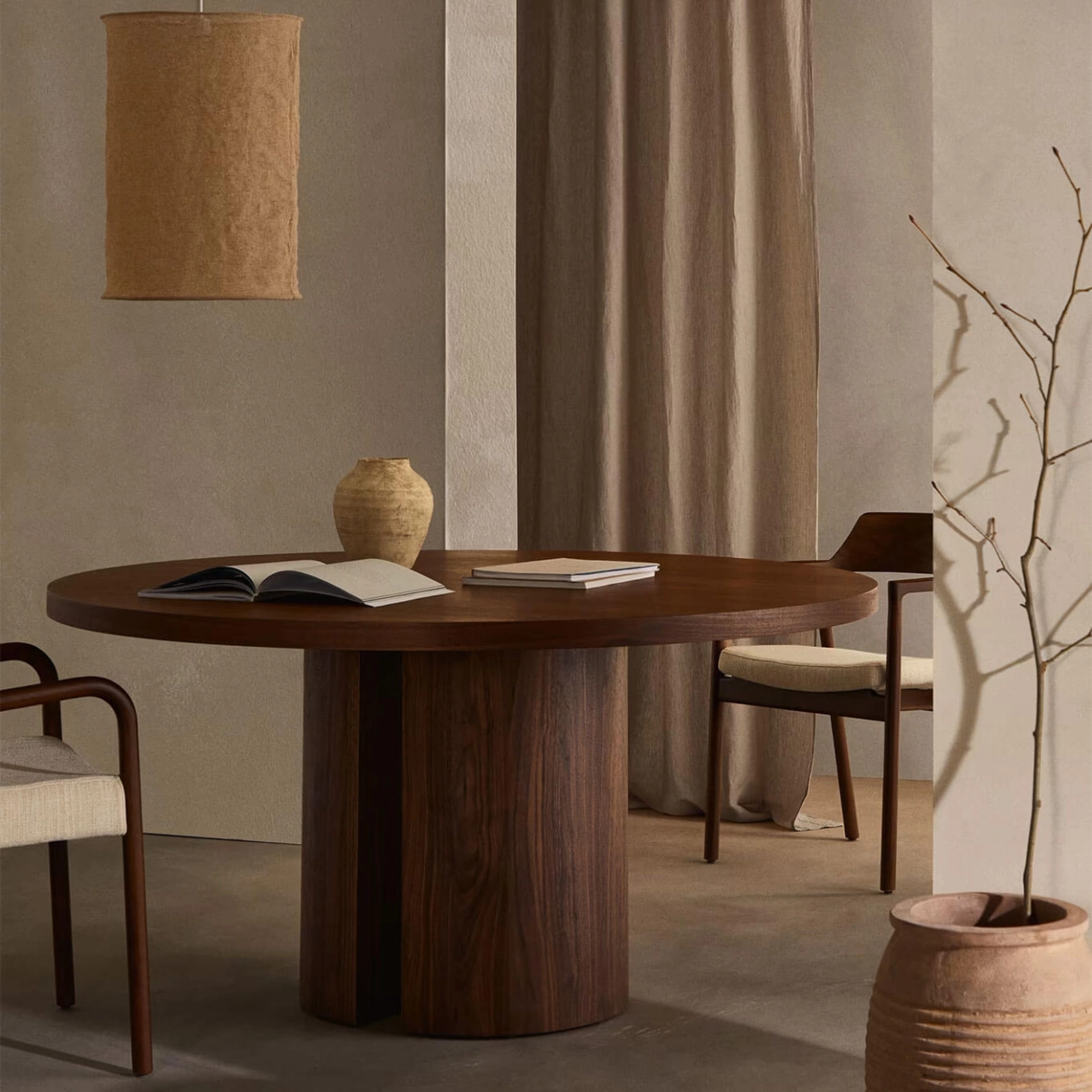 Kave Home, d’un diamètre de 150 cm, alliant simplicité, polyvalence et élégance. Son design sculptural aux lignes courbes et droites met en valeur la beauté naturelle du bois à travers ses veines, tandis que les pieds semi-circulaires peuvent être montés dans deux positions différentes, permettant de personnaliser l’apparence de la table selon vos préférences. Conçue pour accueillir jusqu’à 8 personnes, la table à manger