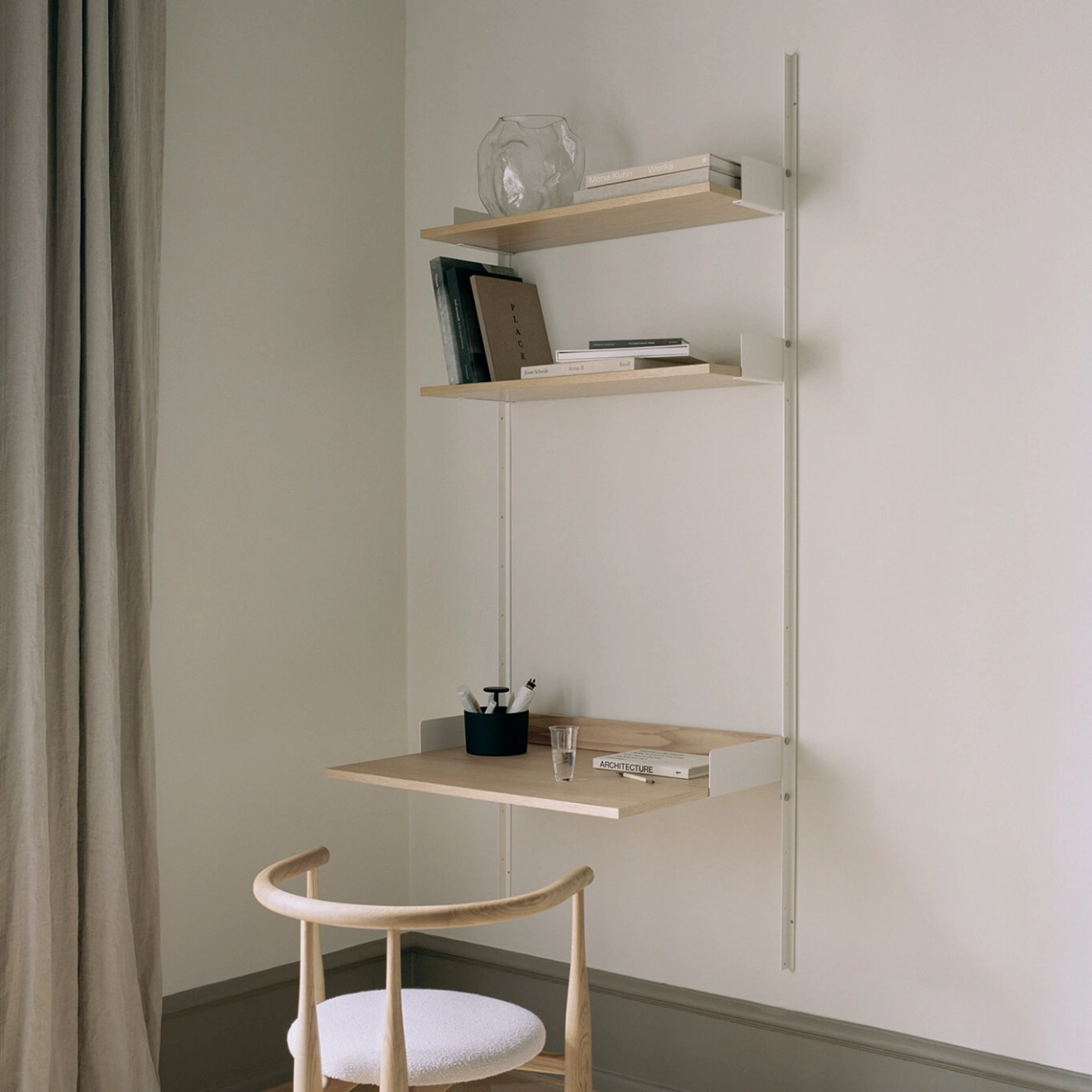 New Works Study est un meuble deux-en-un, pensé pour offrir un espace fonctionnel dédié au travail, aux devoirs, au dessin ou à toute autre activité créative, s’intégrant facilement dans n’importe quelle pièce de la maison. Ce meuble mural est doté de deux étagères en bois et d'un grand plateau, fixés sur une structure en métallique, conférant au meuble une allure moderne et aérienne. Pratique, il dispose d’un passe-câbles intégré, permettant de dissimuler et d’organiser les fils de manière ordonnée, préservant ainsi une atmosphère épurée et harmonieuse dans votre intérieur.