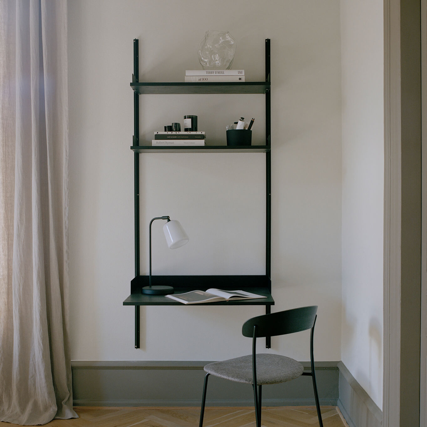 New Works Study est un meuble deux-en-un, pensé pour offrir un espace fonctionnel dédié au travail, aux devoirs, au dessin ou à toute autre activité créative, s’intégrant facilement dans n’importe quelle pièce de la maison. Ce meuble mural est doté de deux étagères en bois et d'un grand plateau, fixés sur une structure en métallique, conférant au meuble une allure moderne et aérienne. Pratique, il dispose d’un passe-câbles intégré, permettant de dissimuler et d’organiser les fils de manière ordonnée, préservant ainsi une atmosphère épurée et harmonieuse dans votre intérieur.