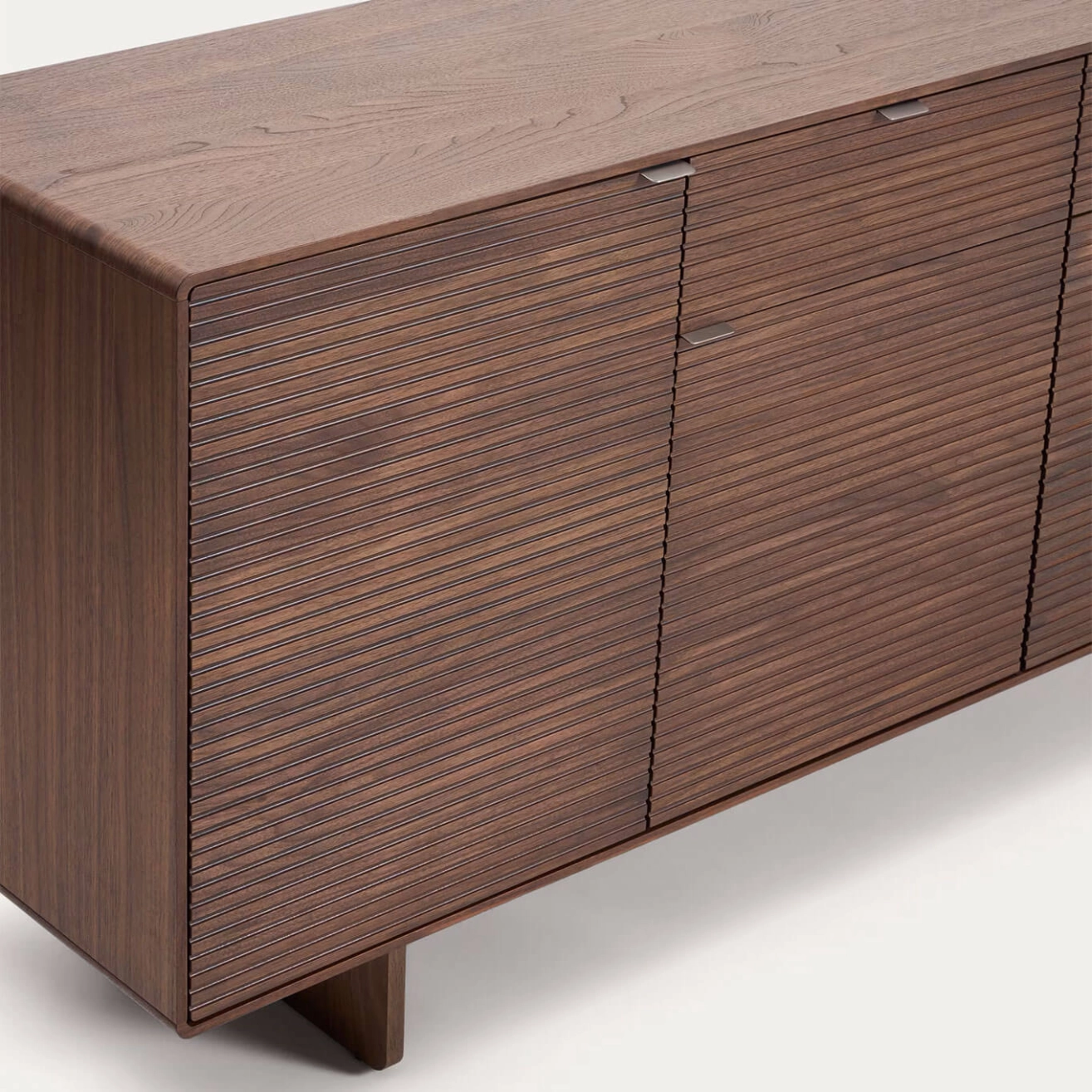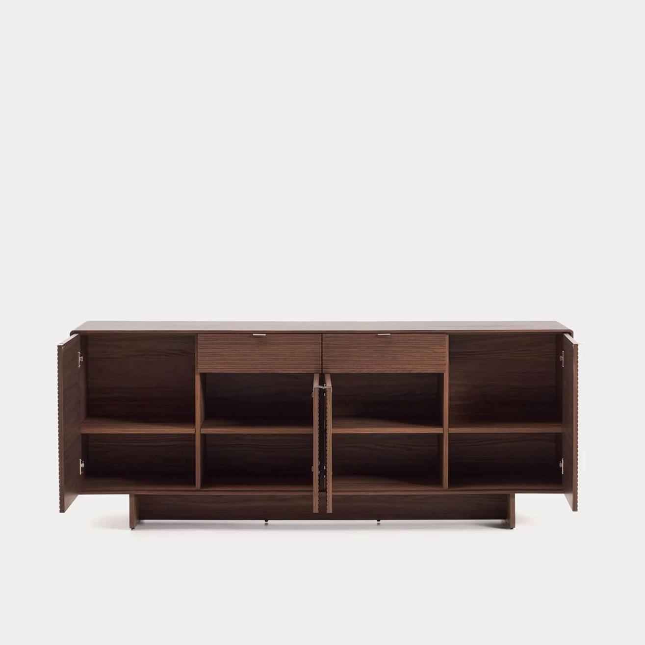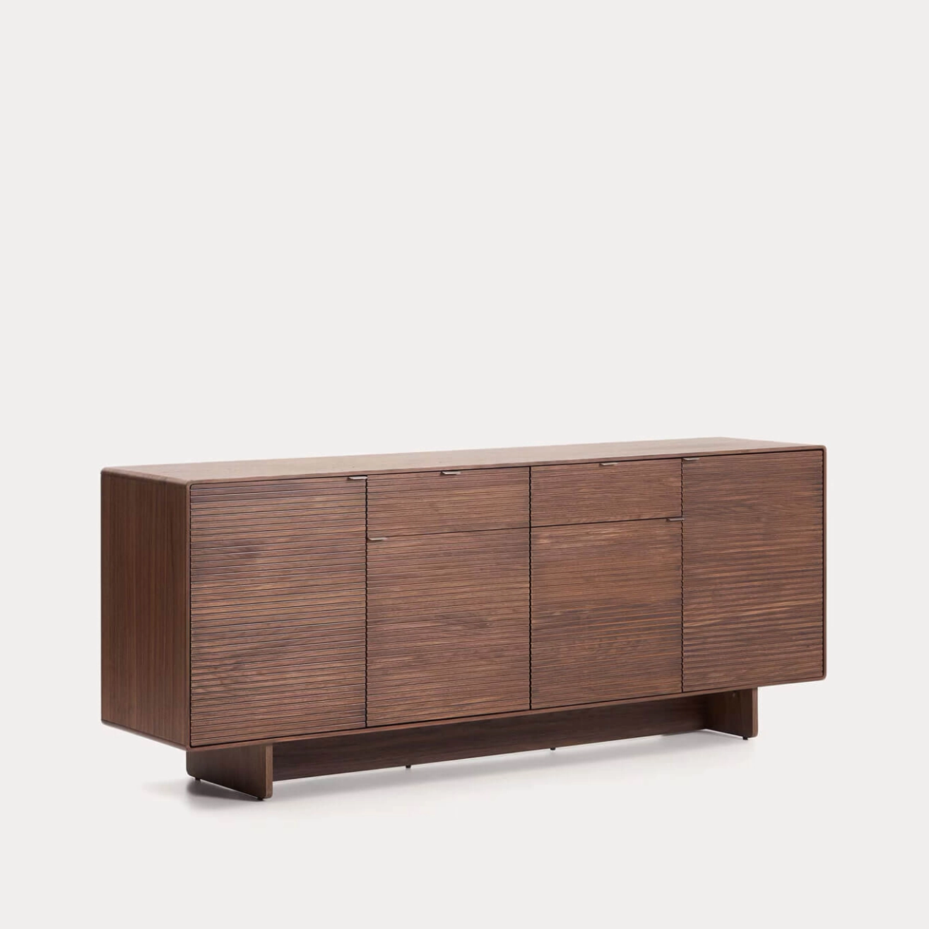 Norlen réinvente les codes du passé avec une touche contemporaine. Des lignes épurées, des détails vintage et des proportions harmonieuses se rencontrent dans des pièces alliant style et fonctionnalité. Le design linéaire, les angles arrondis et les poignées inclinées ajoutent de la profondeur visuelle et une élégance apaisante. Le buffet est fabriqué en placage de noyer de 0,6 mm d’épaisseur, avec 4 portes à charnières à fermeture amortie et 2 tiroirs avec glissières dissimulées, offrant un système d’ouverture par poignée et fermeture douce. Les poignées en acier inoxydable brossé avec finition satinée minimisent les traces de doigts et les rayures, tout en offrant une grande résistance à la corrosion. La finition au vernis polyuréthane assure une excellente résistance à l’usure et à l’humidité. L’intérieur comprend des étagères réglables et la base est équipée de stabilisateurs pour compenser les irrégularités du sol. Le design minimaliste de Norlen, inspiré du style des années 1950, allie des formes simples à des détails vintage. Les angles légèrement arrondis et la base en bois apportent une touche de nostalgie tout en étant réinterprétés avec des lignes pures et modernes. Le placage de noyer foncé s’harmonise avec les tablettes du meuble, créant une pièce cohérente avec profondeur et caractère. La structure est en MDF et les panneaux intérieurs sont revêtus de mélamine, ce qui préserve l’harmonie globale du design. Chaque élément a été conçu pour offrir une fonctionnalité irréprochable sans sacrifier le style, des étagères réglables aux ferrures de haute qualité, avec des charnières et glissières traitées contre la corrosion. Les stabilisateurs dans la base assurent une parfaite stabilité sur toutes les surfaces. Une collection qui transforme la fonctionnalité en une véritable déclaration de style, pensée pour durer.