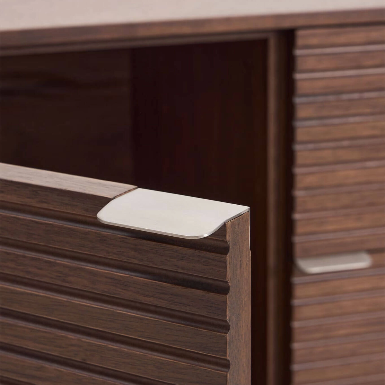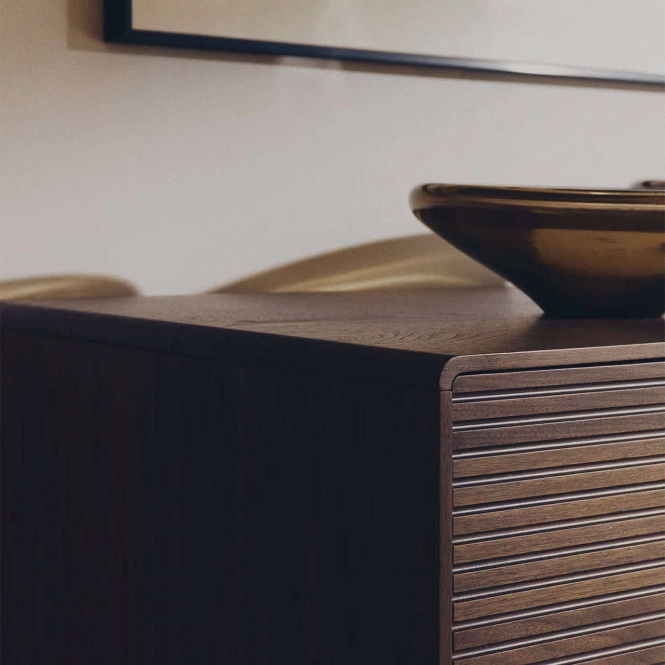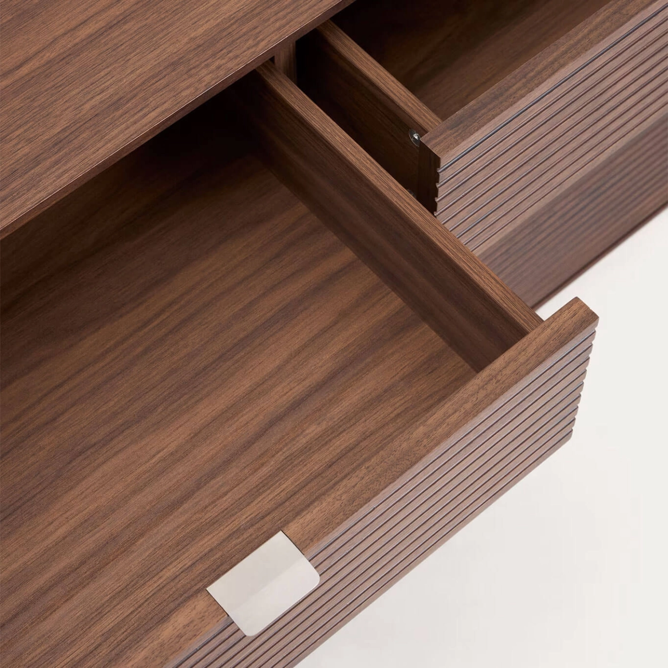 Norlen réinvente les codes du passé avec une touche contemporaine. Des lignes épurées, des détails vintage et des proportions harmonieuses se rencontrent dans des pièces alliant style et fonctionnalité. Le design linéaire, les angles arrondis et les poignées inclinées ajoutent de la profondeur visuelle et une élégance apaisante. Le buffet est fabriqué en placage de noyer de 0,6 mm d’épaisseur, avec 4 portes à charnières à fermeture amortie et 2 tiroirs avec glissières dissimulées, offrant un système d’ouverture par poignée et fermeture douce. Les poignées en acier inoxydable brossé avec finition satinée minimisent les traces de doigts et les rayures, tout en offrant une grande résistance à la corrosion. La finition au vernis polyuréthane assure une excellente résistance à l’usure et à l’humidité. L’intérieur comprend des étagères réglables et la base est équipée de stabilisateurs pour compenser les irrégularités du sol. Le design minimaliste de Norlen, inspiré du style des années 1950, allie des formes simples à des détails vintage. Les angles légèrement arrondis et la base en bois apportent une touche de nostalgie tout en étant réinterprétés avec des lignes pures et modernes. Le placage de noyer foncé s’harmonise avec les tablettes du meuble, créant une pièce cohérente avec profondeur et caractère. La structure est en MDF et les panneaux intérieurs sont revêtus de mélamine, ce qui préserve l’harmonie globale du design. Chaque élément a été conçu pour offrir une fonctionnalité irréprochable sans sacrifier le style, des étagères réglables aux ferrures de haute qualité, avec des charnières et glissières traitées contre la corrosion. Les stabilisateurs dans la base assurent une parfaite stabilité sur toutes les surfaces. Une collection qui transforme la fonctionnalité en une véritable déclaration de style, pensée pour durer.