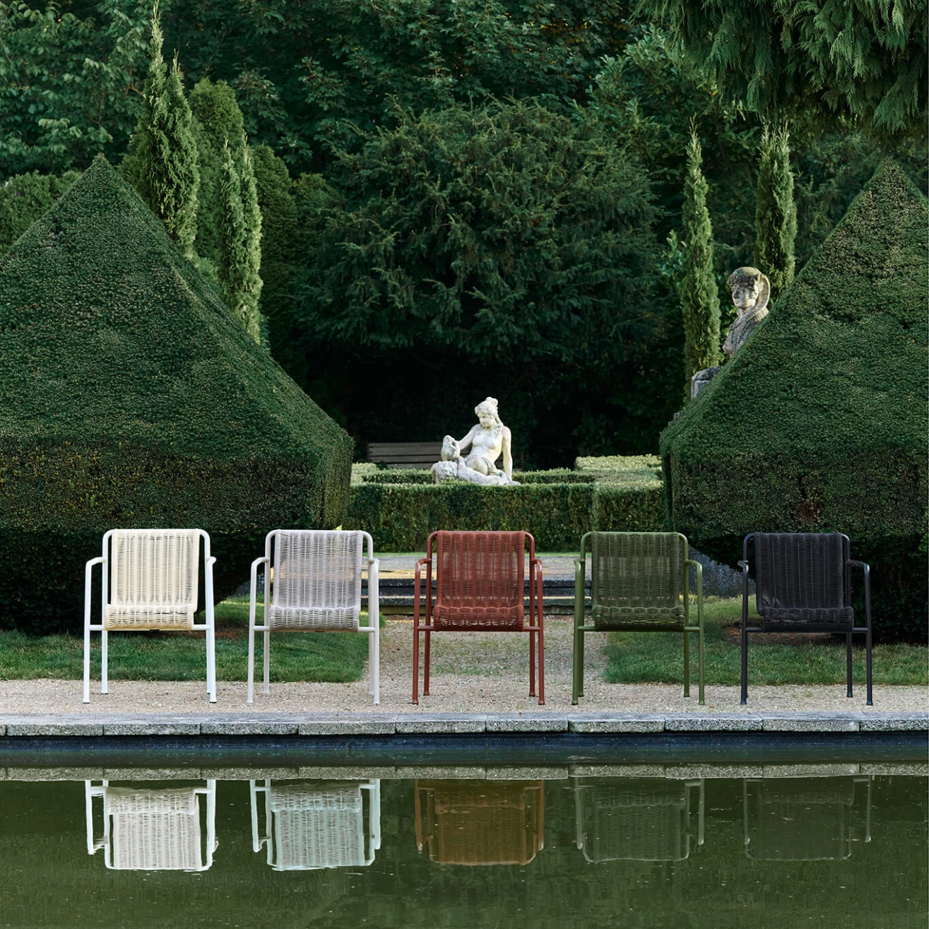 Inspirée par une géométrie symétrique commune, la collection de mobilier d'extérieur Palissade Cord est pensée pour s'harmoniser aussi bien avec les paysages naturels qu'avec les environnements urbains. Le fauteuil de repas Palissade Cord reprend l'esthétique de la collection originale, en lui apportant une touche plus douce tout en conservant la simplicité visuelle et la solidité caractéristiques de Palissade Cord. Son assise, réalisée en cordon de polyester recyclé tissé à la main, s'accorde parfaitement avec la structure en acier revêtu de poudre pour un ensemble à la fois élégant et résistant. Grâce à sa palette de couleurs polyvalente et son design intemporel, ce fauteuil s'intègre facilement dans divers espaces extérieurs, qu'il s'agisse de cafés, restaurants, jardins, terrasses ou balcons.