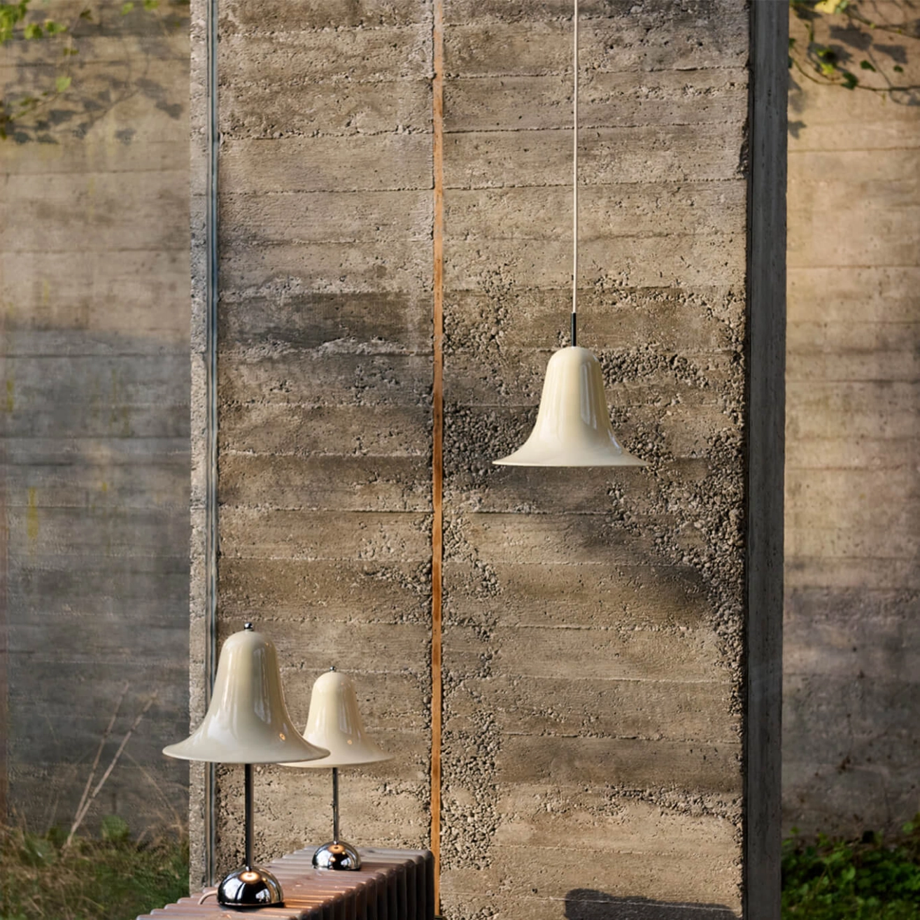 L’élégante ligne Pantop, conçue par Verner Panton en 1980, est un incontournable de la collection Verpan. La Pantop se distingue par son abat-jour en forme de cloche, largement évasé et orienté vers le bas, qui diffuse une lumière douce et homogène. La version Pantop Ø23 est proposée dans une large palette de couleurs : blanc crème, orange vif, rouge cerise, marron foncé, bleu nuit, bleu sarcelle foncé, bleu sarcelle clair et chrome. Son design iconique et ses finitions raffinées en font une pièce polyvalente et intemporelle, idéale pour tous les intérieurs contemporains.