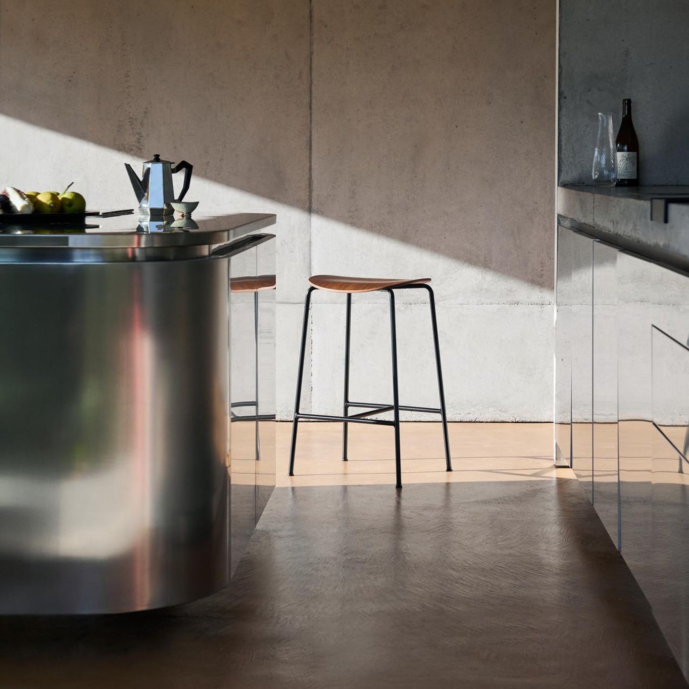 La collection Pavilion, imaginée par le duo norvégien Anderssen & Voll pour &Tradition, revisite avec subtilité l’esthétique moderniste des années 50 tout en lui insufflant une légèreté contemporaine. Composée de chaises, fauteuils et tabourets, la série Pavilion se distingue par une structure en acier tubulaire finement cintrée et une assise en placage de bois courbé, offrant un équilibre entre élégance, ergonomie et durabilité. Le tabouret Pavilion conserve l'élégance et la qualité des chaises de la même collection. Grâce à ses formes douces et aériennes, le tabouret Pavilion s’intègre avec naturel aussi bien dans un intérieur résidentiel que dans des espaces professionnels.