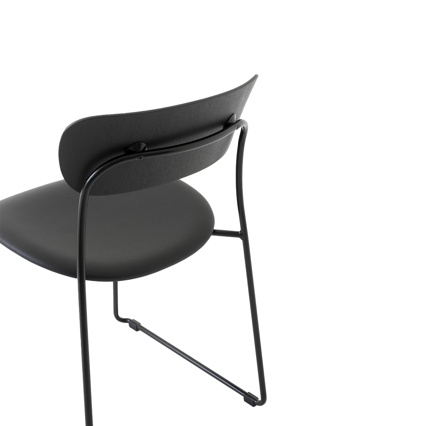 Assise mousse et revêtement cuir, dossier en chêne laqué noir, structure en acier