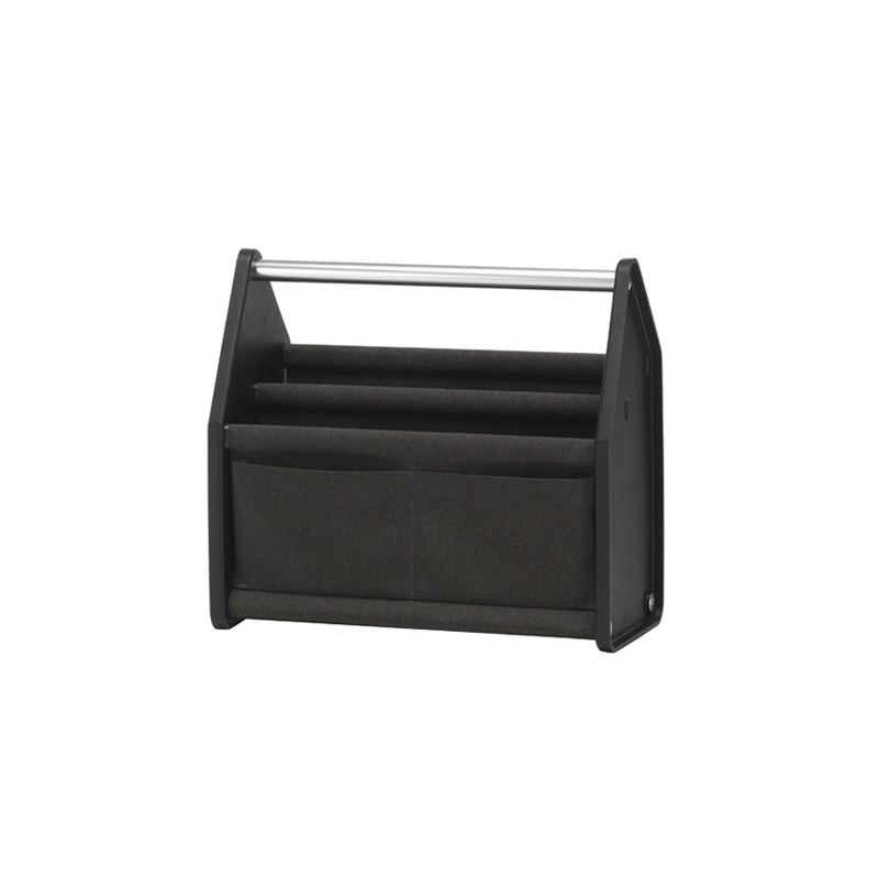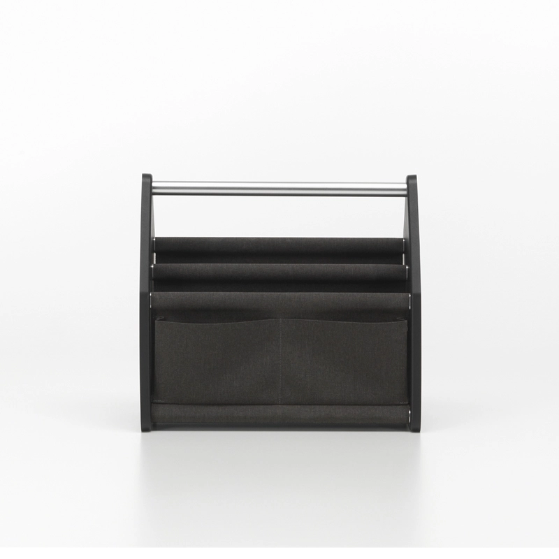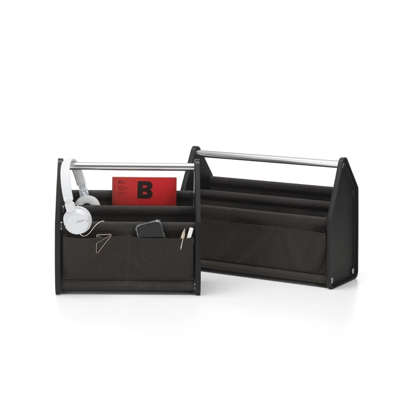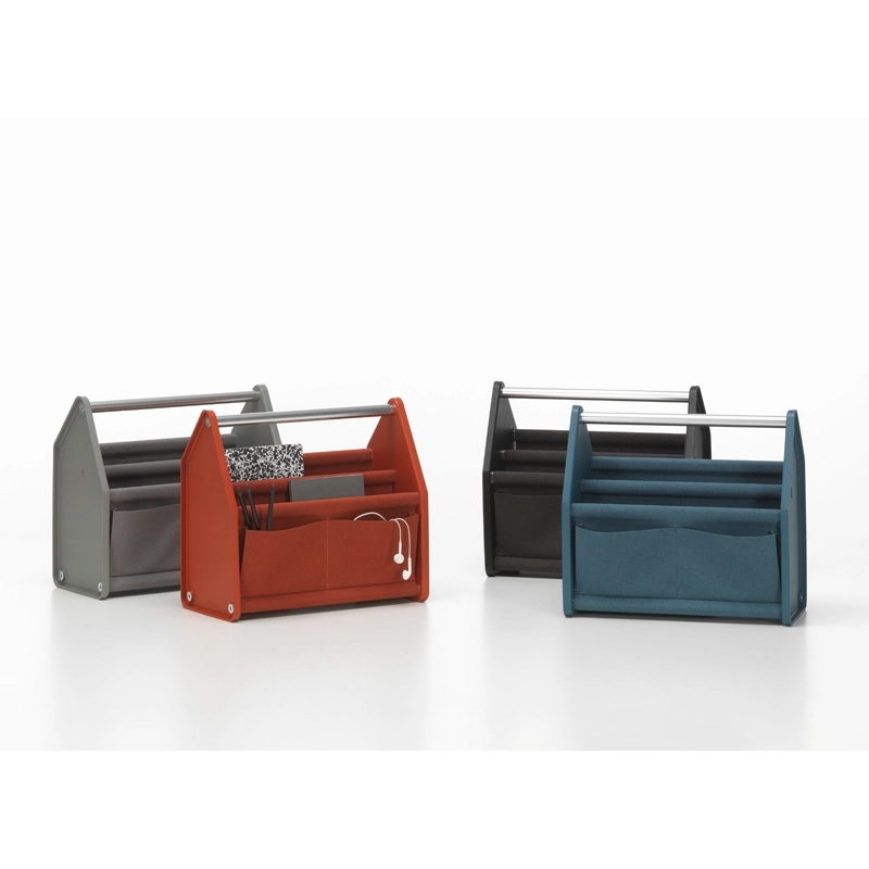 Avec Locker Box, Konstantin Grcic a conçu pour Vitra un accessoire pratique pour transporter tous les ustensiles de travail à la maison comme au bureau, et les ranger facilement en fin de journée. Disponible en deux tailles, ce petit rangement fonctionnel et transportable facilement s’adapte aux nouvelles méthodes de travail flexibles, pouvant contenir tout ce qui est nécessaire aux tâches professionnelles : ordinateur portable, clavier, papiers, stylos, câbles, disques durs, écouteurs… Locker Box se caractérise par une construction simple et robuste. Deux panneaux latéraux en plastique recyclé sont assemblés à l‘aide de tubes en aluminium. Le tube supérieur sert de poignée. Une structure de panneaux textiles avec des coutures soudées est suspendue sur les cinq tubes restants, formant des compartiments.
