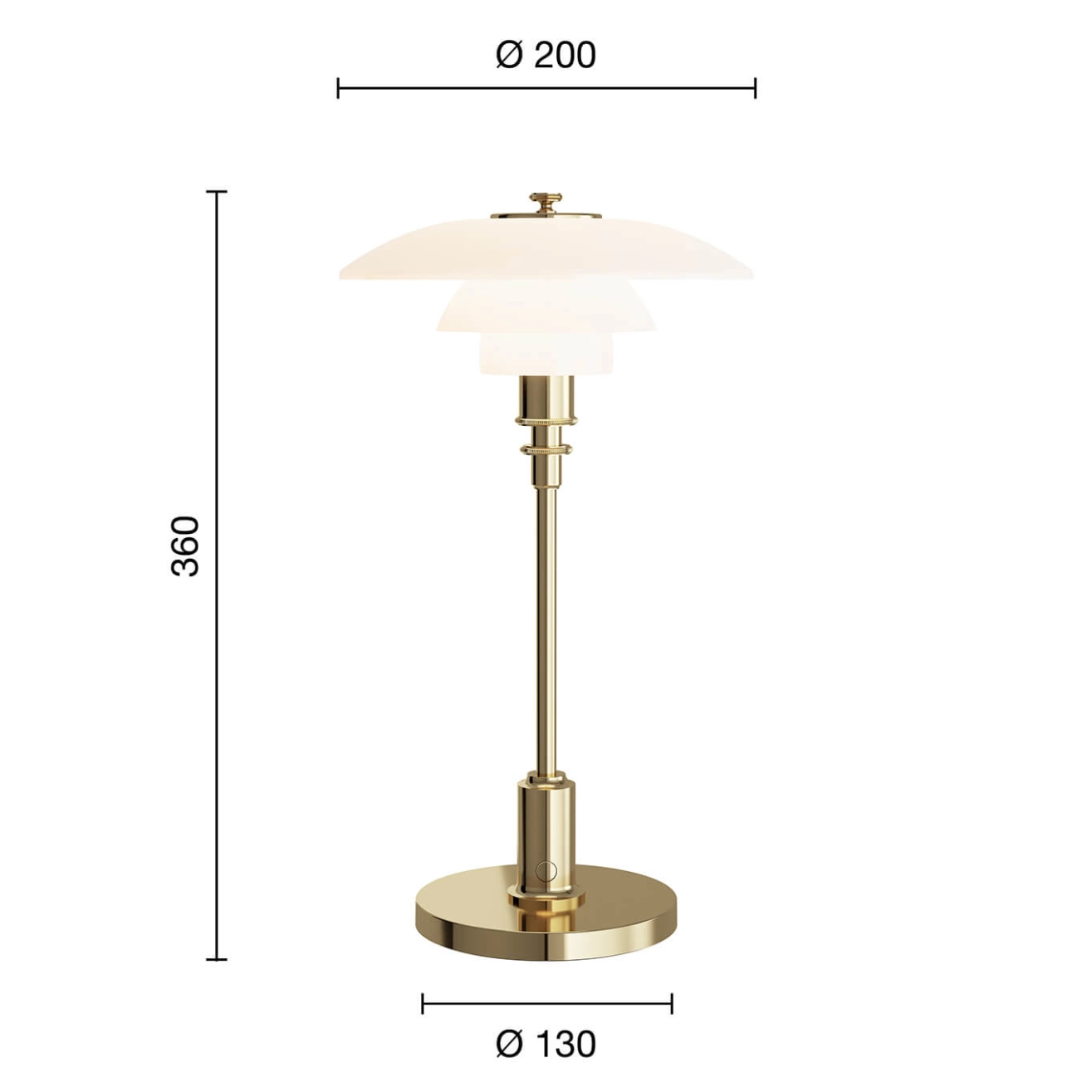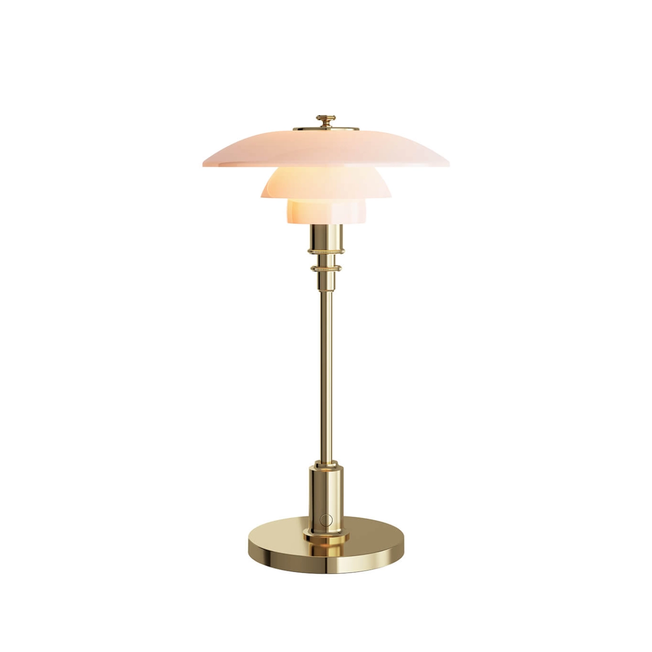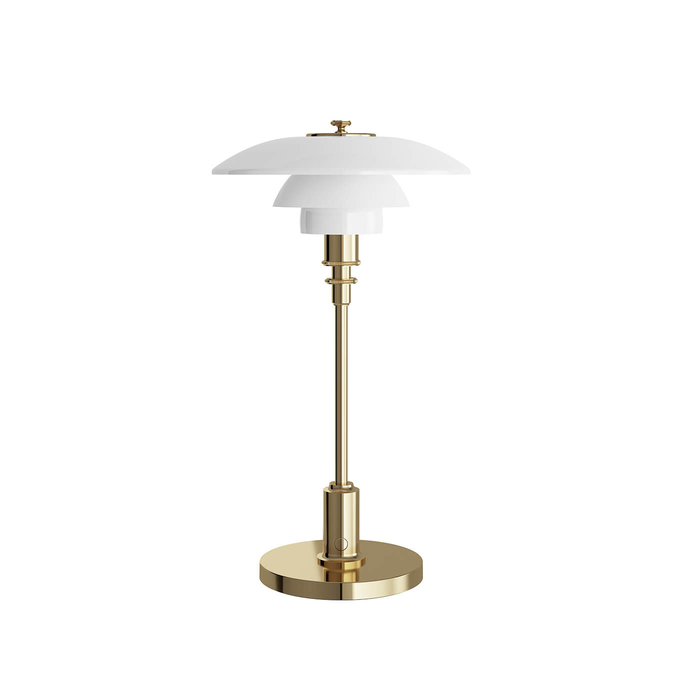 Le luminaire PH 2/1, dessiné par Poul Henningsen pour Louis Poulsen, est conçu selon le principe d'un ensemble d'abat-jour réfléchissants, qui dirige la majeure partie de la lumière vers le bas. Les abat-jour sont composés de trois couches de verre opalisé soufflé, poli à l’extérieur et sablé à l’intérieur, qui émettent une lumière douce et diffuse. La PH 2/1 Portable est une version sans fil de la petite lampe de table classique, avec des abat-jours en verre opalin soufflé à la bouche, un pied et une base en chrome brillant ou en laiton métallisé. La version portable de la lampe est parfaite pour une utilisation en intérieur et en extérieur, comme dans une bibliothèque ou sur une table de chevet.