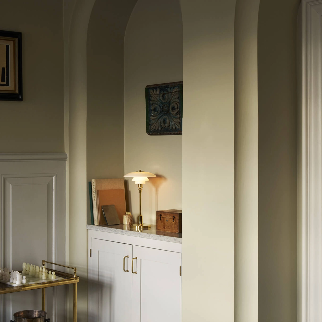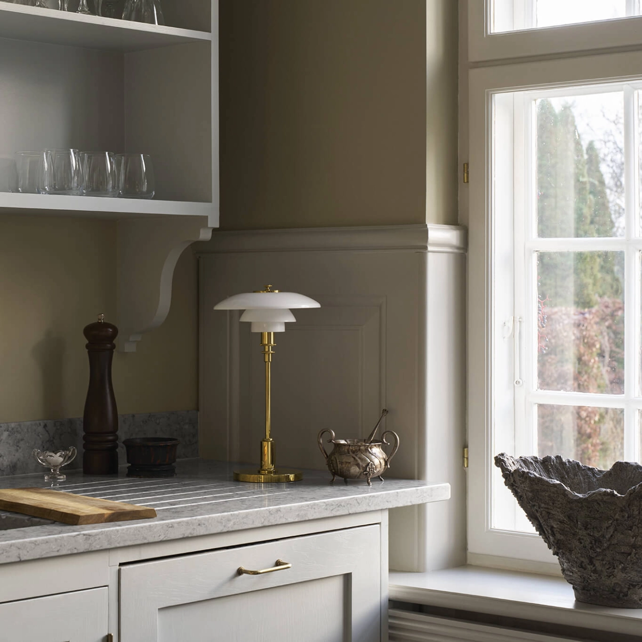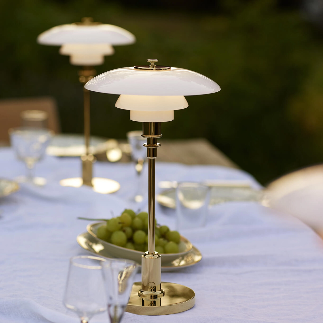 Le luminaire PH 2/1, dessiné par Poul Henningsen pour Louis Poulsen, est conçu selon le principe d'un ensemble d'abat-jour réfléchissants, qui dirige la majeure partie de la lumière vers le bas. Les abat-jour sont composés de trois couches de verre opalisé soufflé, poli à l’extérieur et sablé à l’intérieur, qui émettent une lumière douce et diffuse. La PH 2/1 Portable est une version sans fil de la petite lampe de table classique, avec des abat-jours en verre opalin soufflé à la bouche, un pied et une base en chrome brillant ou en laiton métallisé. La version portable de la lampe est parfaite pour une utilisation en intérieur et en extérieur, comme dans une bibliothèque ou sur une table de chevet.