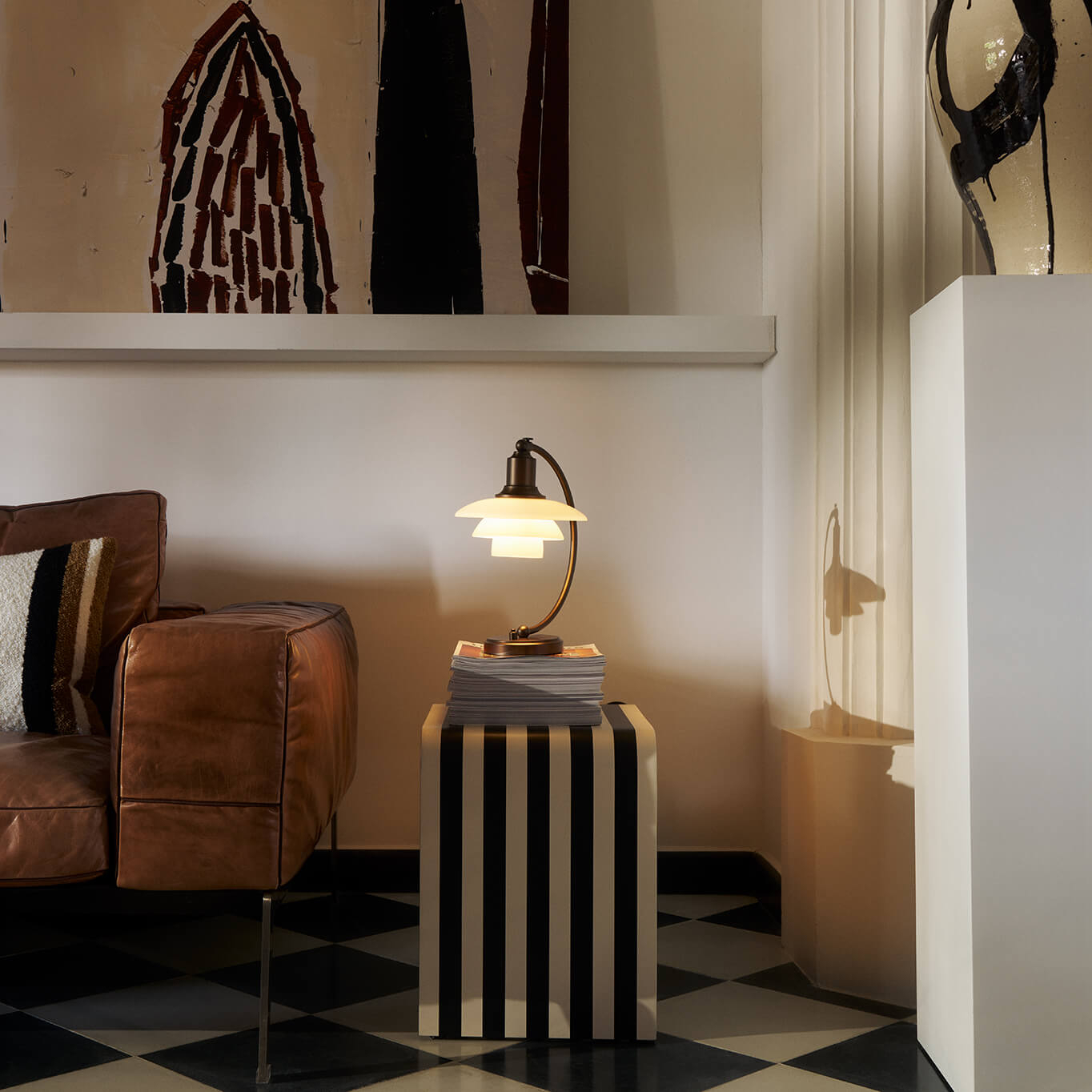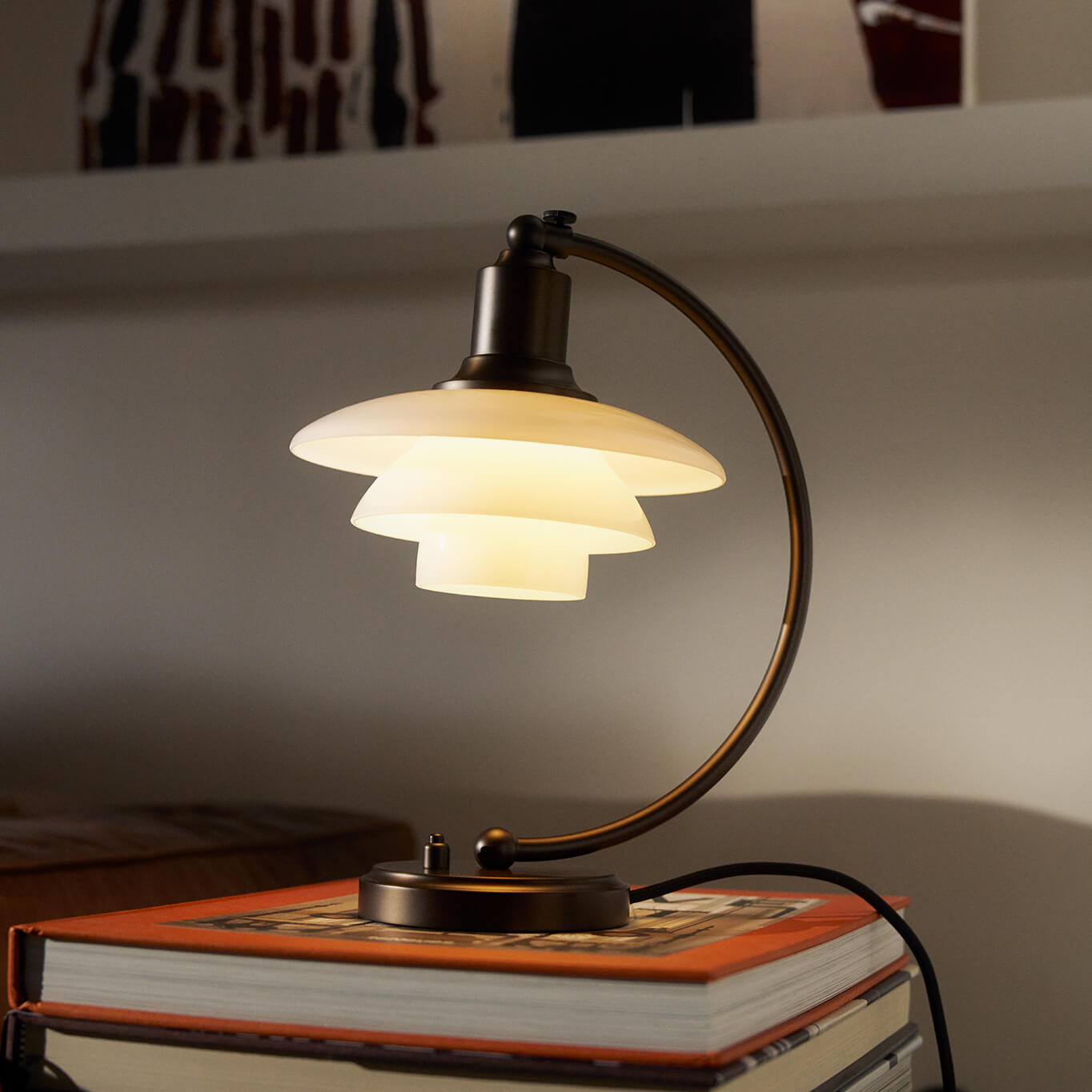 Initialement lancée en 1939, la PH Luna était connue sous le nom de lampe de chevet (« Night Stand Lamp »), un nom donné à la petite lampe de table par son designer, Poul Henningsen. Editée par Louis Poulsen, la lampe PH 2/2 Luna est conçue selon le principe d'un ensemble d'abat-jour réfléchissants, qui dirige la majeure partie de la lumière vers le bas. Les abat-jour sont composés de trois couches de verre opalisé soufflé, poli à l’extérieur et sablé à l’intérieur, qui émettent une lumière douce et diffuse.