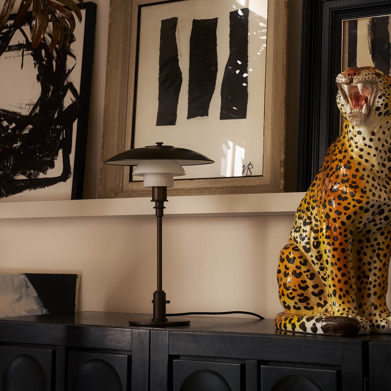 Le luminaire PH 3/2 Table dessiné par Poul Henningsen pour Louis Poulsen est conçu selon le principe d'un ensemble d'abat-jour réfléchissants, qui dirige la majeure partie de la lumière vers le bas. La lampe PH 3/2 est dotée d’une magnifique finition laquée en laiton bruni foncé, rappelant les lampes PH originales des années 1920. Associée à d’élégants abat-jours en verre blanc opalin soufflé à la bouche, cette lampe apporte une touche classique à n’importe quelle table, étagère ou bureau. Intemporelle, la lampe PH 3/2 laiton vieilli Louis Poulsen s'intègre dans les styles d'intérieurs.