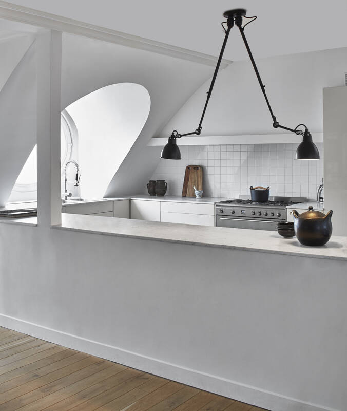 Le plafonnier N°302 Double est particulièrement élégant et graphique avec ses deux bras articulés et réglables. Il s’adapte à toutes les situations et les besoins d’éclairage : en tête de lit, derrière un canapé, au-dessus d’un plan de travail.