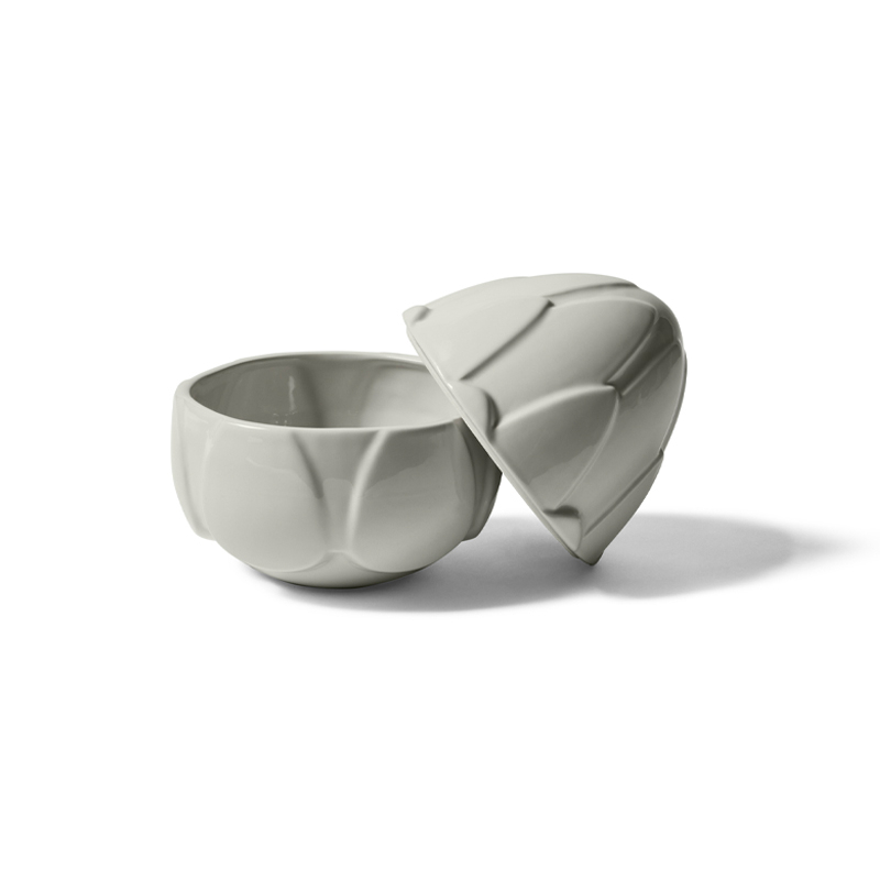 collection se compose de quatre récipients en céramique émaillée, prenant la forme d'une citrouille, d'un oignon, d'une asperge et d'un poulet, disponibles en trois couleurs. À travers la sensorialité, les
