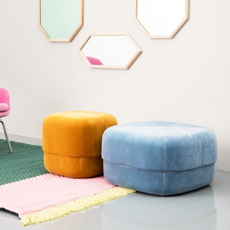 Circus est un pouf élégant au style nordique, conçu par Simon Legald pour Normann Copenhagen. Il est disponible en deux tailles et se décline plusieurs couleurs de velours, invitant au confort. Le designer s'inspire du classique pouf de tradition marocaine, et y associe des formes simples et des lignes graphiques pour apporter un côté plus moderne. Circus est constitué de deux différents types de mousse de polyuréthane : une mousse dure lui permettant de conserver sa forme pour la partie inférieure et une mousse plus moelleuse lui conférant ainsi un confort d'assise optimal pour la partie supérieure. Petit mobilier multifonction, il peut servir de pouf, de table d'appoint sans le salon.