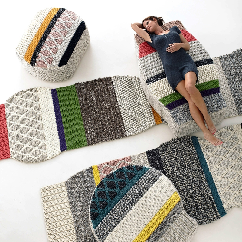 Mangas, de l'espagnol « manches », est à l'origine du projet, une collection de tapis dessinée par Patricia Urquiola pour la maison de textile espagnole Gandia Blasco. De formes et de couleurs variées, ces tapis ressemblent à des vêtements tricotés à la main et mis à plat. En 2011, cette collection s'agrandit pour intégrer des poufs qui reprennent les motifs des tapis dessinées par la designer. Patricia Urquiola s'inspire du travail du patchwork en mélangeant plusieurs techniques, donnant ainsi l'idée de différents tricots assemblés les uns aux autres. En forme de ballon, de clochette ou d'une petite lanterne, les tapis, et maintenant les poufs sont allongés pour prendre les dimensions d'un rectangle. La collection Mangas a été récompensée par de nombreux prix internationaux de design depuis son lancement en 2009. Cette série de poufs invitent à s'étendre délicatement dessus et confèrent une atmosphère cosy dans la pièce. Une invitation à la détente, tout simplement.