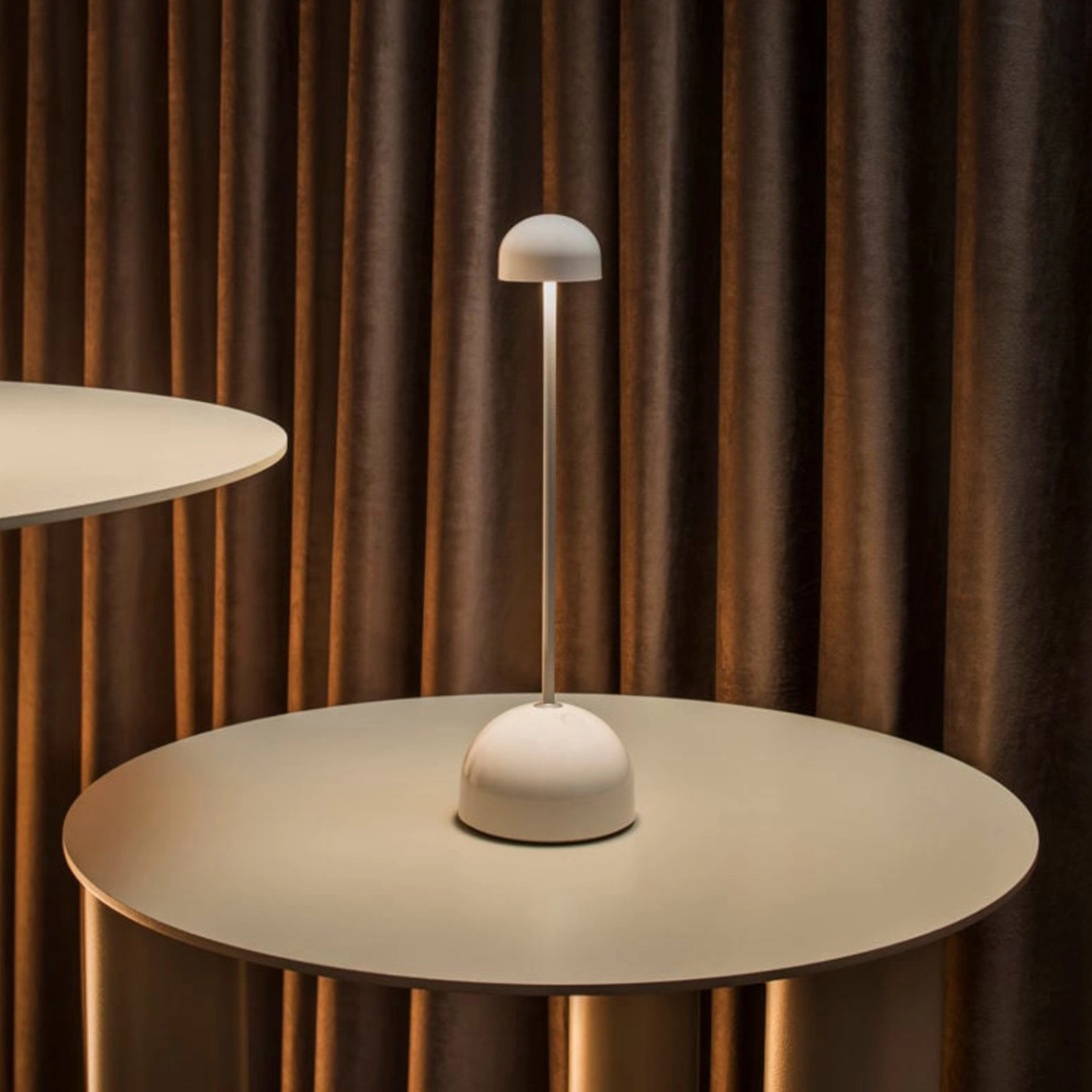 Sips est une lampe portable au design ingénieux et minimaliste signé Christophe Mathieu pour Marset. Son petit abat-jour opaque diffuse une lumière intime et précise, parfaite pour créer une atmosphère chaleureuse sur une table, en intérieur comme en extérieur. Dotée d’une base stable avec interrupteur tactile à trois intensités, elle se décline en trois finitions : blanc chaud avec tige argentée et vert ou brun foncé avec tige dorée. Sans fil, légère et discrète, elle s’intègre naturellement dans les espaces de restauration, bars ou terrasses, offrant une lumière soignée et sans éblouissement.