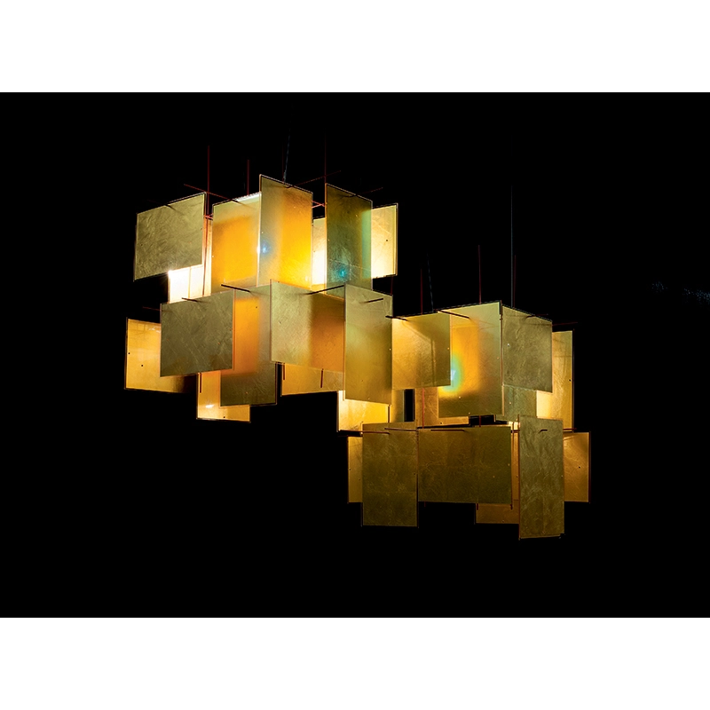 La suspension Karat Blau du designer Axel Schmid et de la marque Ingo Maurer est une pièce unique qui attire les regards. Elle est composée d'une structure en métal rouge, sur laquelle sont suspendues des plaques dorées, qui peuvent être accrochées en format portrait ou paysage, selon les goûts de chacun et ainsi créer une suspension très personnelle. Chaque écran en or de 1000 Karat Blau est produit au Japon individuellement et à la main. La très fine feuille d'or est ensuite coulée dans des plaques en acrylique selon un procédé unique. Grâce à la technique de frappe spéciale de l'or, la feuille d'or très fine présente un magnifique motif en forme d'étoile. Les couleurs rouge des tiges et bleue du point lumineux fournissent un superbe contraste avec l'or. Les suspensions Karat Blau d’Ingo Maurer sont des pièces maitresses qui garantissent élégance et fascination.