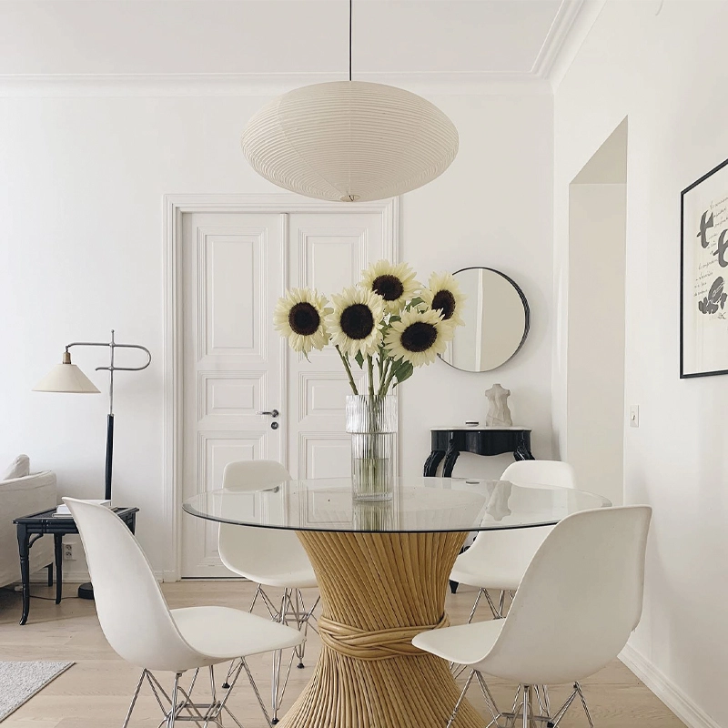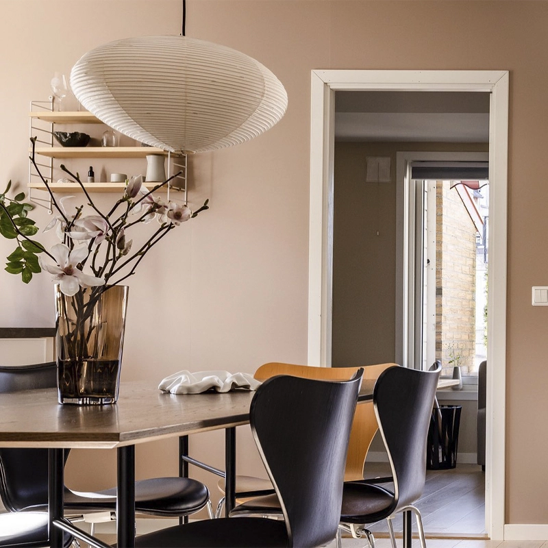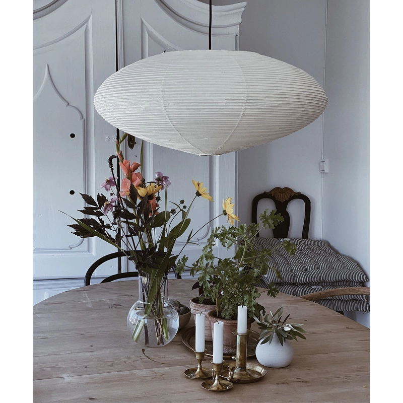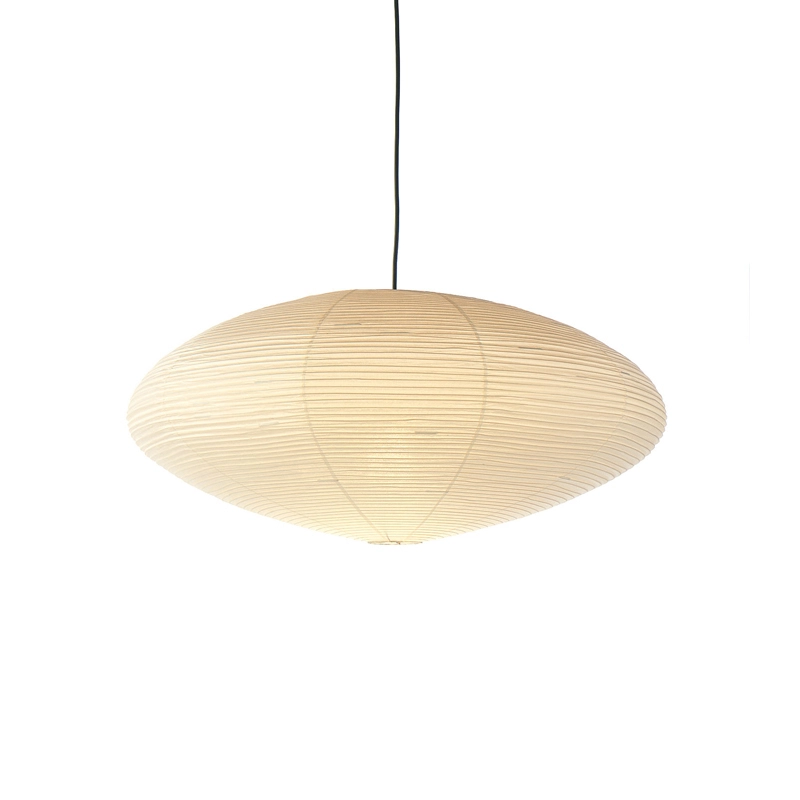 En 1951, l’artiste nippo-américain Isamu Noguchi crée les Akari Light Sculptures, une collection de luminaires artisanaux tout à fait uniques, éditée par Vitra. Ces sculptures de papier s’incluent à l’œuvre déjà très diverse du créateur, qui s’étend du mobilier jusqu’à l’aménagement d’espaces en tous genres. Le style sculptural de Noguchi prend en compte, en plus du matériau et de la forme, l’harmonie produite par chaque pièce et l’espace qu’elle occupe, ce qui lui a permis d’influencer durablement le design organique depuis les années 1950. Les lampes Vitra Akari – terme japonais signifiant clarté ou lumière – évoquent une certaine sensation de légèreté et de délicatesse, tout comme les ombrelles ou lampions artisanaux en papier, qui ont inspiré leur conception. Chacun des luminaires dont Akari 15A est fabriqué à la main : l’ossature de la lampe est obtenue par des tiges de bambou tendues, enveloppées de fines bandelettes de papier washi collées à la structure.