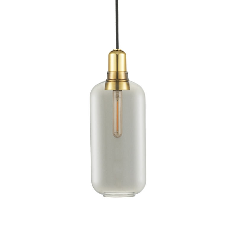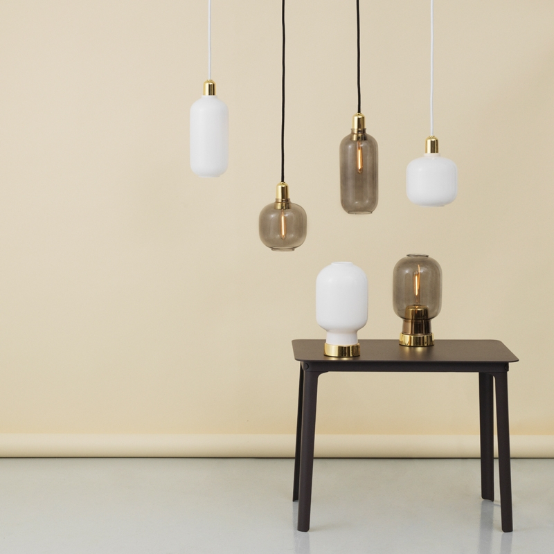 Pour Normann Copenhagen, le designer danois Simon Legald a conçu Amp, une gamme de lampes raffinées. L'idée de la forme de ces lampes est venue au designer un jour où il restaurait une vieille radio datant des années 1960. La forme ovale simple des lampes et la lumière qu'elles émettent y font ouvertement référence, tout comme le nom Amp, qui reprend l'abréviation du termes anglais « tube amplifier ». Les deux modèles de suspension et de lampe de table de la série Amp existent désormais en laiton. Le métal brillant reflète son environnement en lui donnant un éclat flamboyant qui apporte personnalité et brio. Le modèle en laiton se décline avec deux types d'abat-jour : un en verre fumé transparent, l'autre en verre blanc opale.