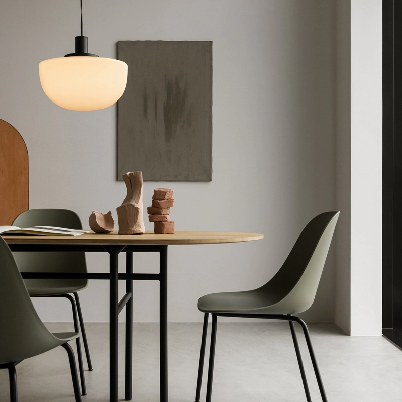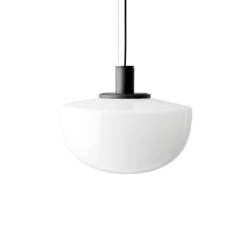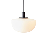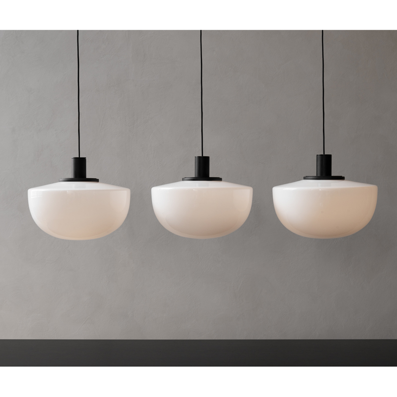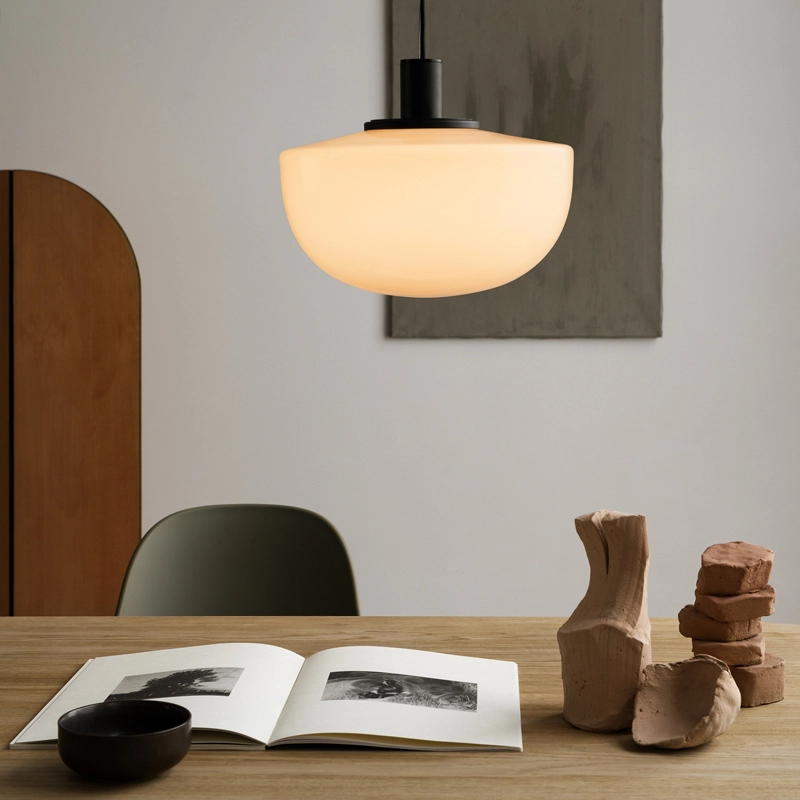 Bank est une suspension semi-circulaire réalisée en verre soufflé opalin ou fumé et associé et en aluminium finition époxy noir. Le verre opaque diffuse avec douceur une lumière à 360 degrés, créant une lumière à la fois fonctionnelle et d’ambiance. Les matériaux utilisés assurent une lampe de qualité, faite pour durer dans le temps. Les fondateurs de Norm Architects se sont inspirés d’une suspension de style vintage, repérée plusieurs fois à New York en se promenant dans le quartier financier. La forme – née dans les années 1920 – a rapidement été modernisée dans l’imagination des designers, devenant la