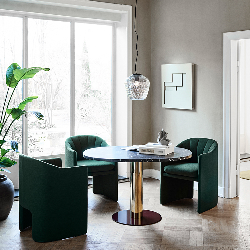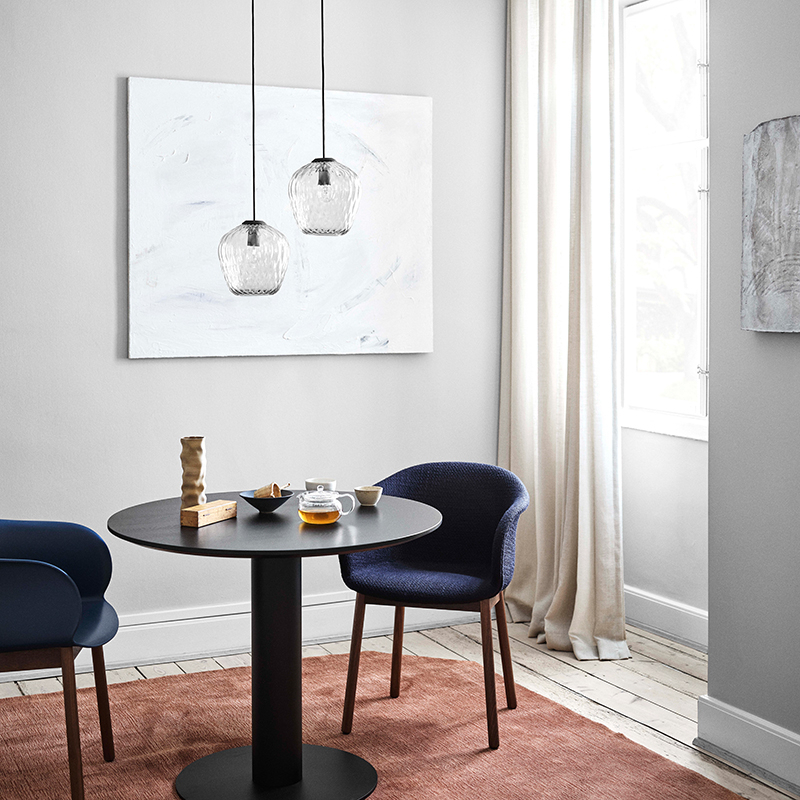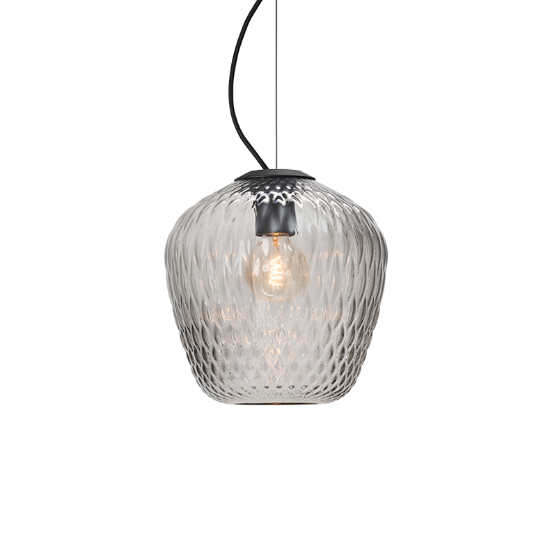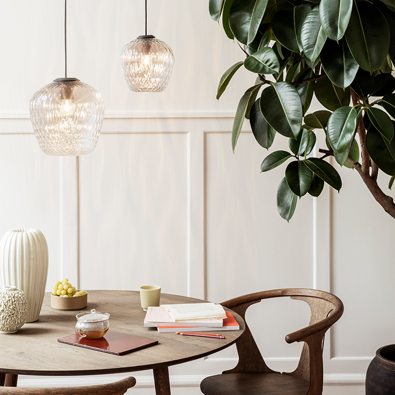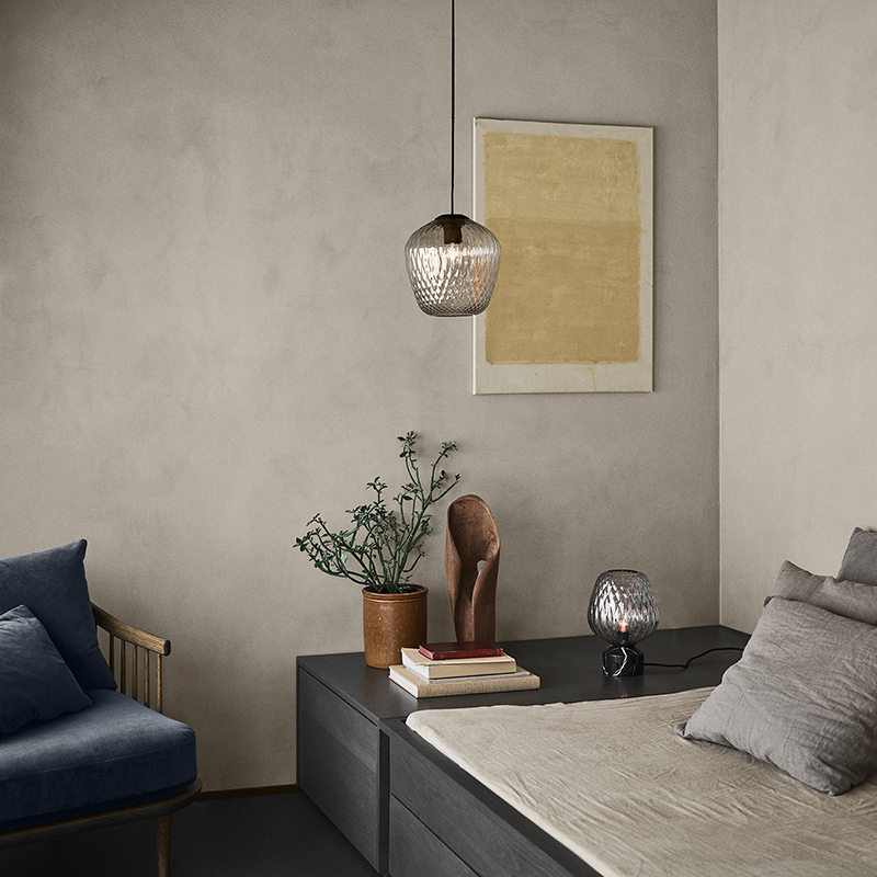 And Tradition combine des procédés industriels associés au travail artisanal des maîtres verriers. La texture du verre est créée avec une aide informatique pour contrôler de façon précise la taille de chaque bulle. La forme est déterminée par un moulage puis soufflée à la main. C'est une suspension qui se suffit à elle-même, mais fonctionne aussi très bien en grappe au dessus d'une table de salle à manger par exemple. La version sablée apporte une lumière subtile et sophistiquée, tandis que la version transparente transforme l'espace et l'habite avec la projection de ses motifs.