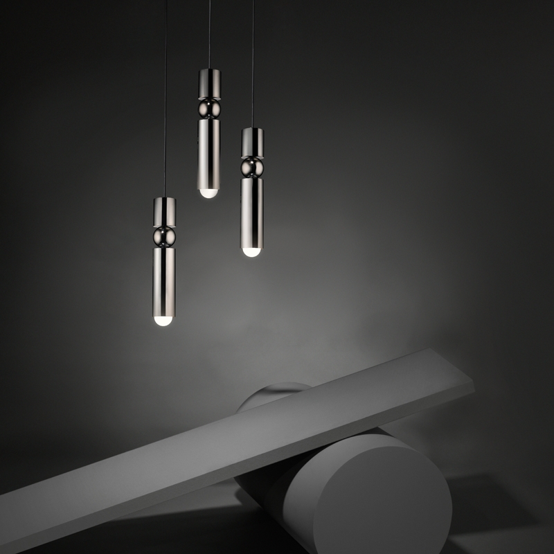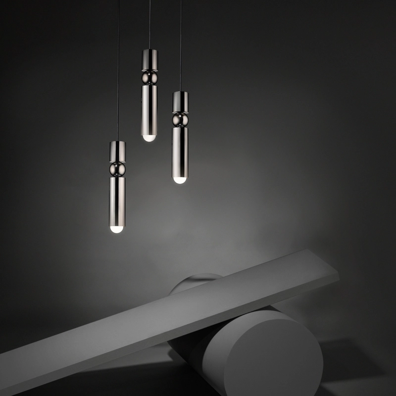 Imaginée et éditée par le talentueux Lee Broom, Fulcrum est une suspension fine et élégante. Telle une sculpture minimaliste, elle composée de deux cylindres réunis par une sphère centrale. L'ampoule visible imite symétriquement la silhouette de la sphère. Déclinée en version chrome, laiton et noir mat, Fulcrum est également disponible en lustre composé de 5 pièces.