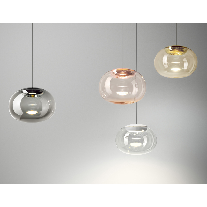 La collection de luminaires La Mariée de Stilnovo, se composent d’une sphère éthérée en verre soufflé dans des tons précieux de rose, d’or ou fumée et d’une base ou boitier de suspension. La forme légèrement ovale des luminaires La Mariée et leur source lumineuse invisible créent une lumière d’ambiance douce animée de reflets. Seule ou dans une composition, La Mariée apporte une touche d’élégance à la pièce, se déclinant en suspension ou en lampe à poser pour d’adapter au mieux à votre intérieur.