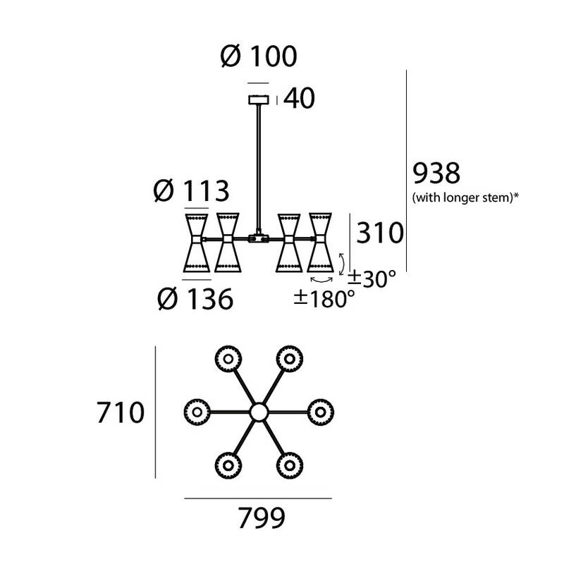 Megafono de Stilnovo est une suspension emblématique des années 1950 dotée d'une lumière directe et indirecte. L'abat-jour à double cône réglable de la suspension Megafono éditée par Stilnovo est associé à la tige en laiton précieux à dorure galvanique, pour éclairer avec une touche raffinée. La suspension Megafono est disponible en version 3, 6 ou 8 branches.