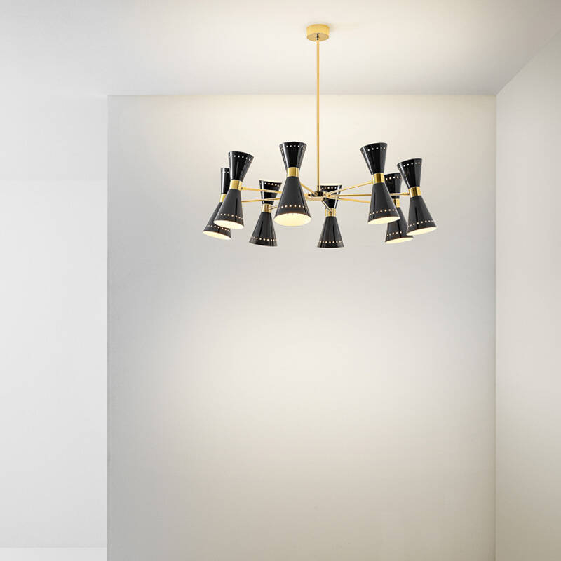 Megafono de Stilnovo est une suspension emblématique des années 1950 dotée d'une lumière directe et indirecte. L'abat-jour à double cône réglable de la suspension Megafono éditée par Stilnovo est associé à la tige en laiton précieux à dorure galvanique, pour éclairer avec une touche raffinée. La suspension Megafono est disponible en version 3, 6 ou 8 branches.