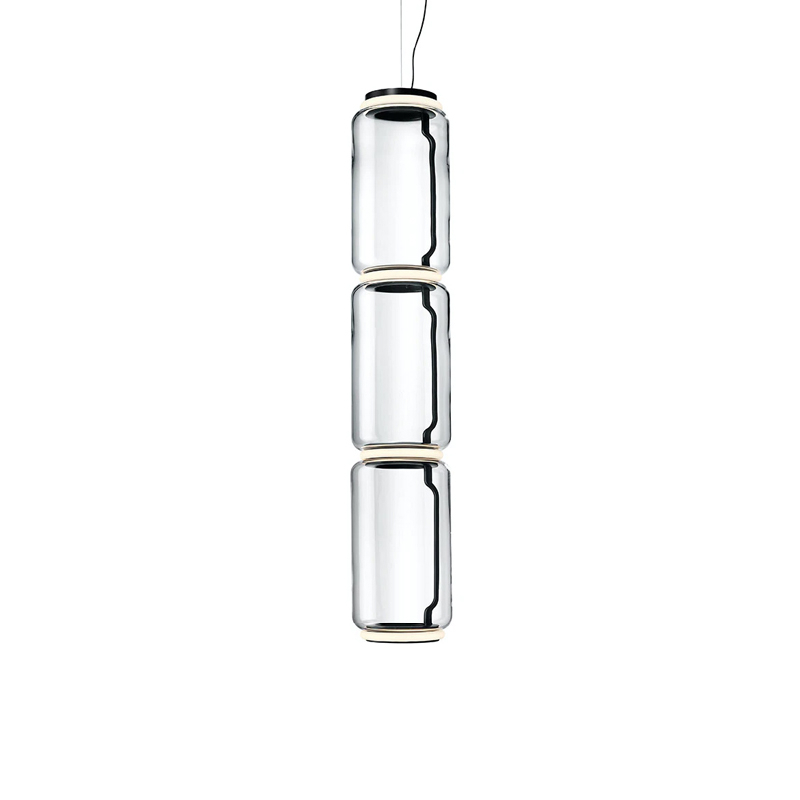 Flos sont constituées d’un empilement de modules transparents, fabriqués artisanalement en verre soufflé. Les modules sont maintenus par une structure interne en métal laqué noir. Les formes géométriques se superposent donnant naissance à des constructions sculpturales qui offrent un équilibre extraordinaire entre les proportions et l’élégance des matériaux.