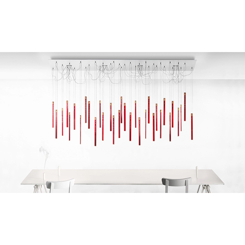 La suspension One New Flame de Moritz Waldemeyer, d’Ingo Maurer et de son équipe fait partie de la même collection que la lampe My New Flame. Imitant le mouvement de la flamme d'une bougie, cette lampe est équipée de LEDs, programmées sur la base de séquences vidéo. Les LED forment un rectangle de part et d'autre de la fine platine, de sorte que l'image de la flamme est visible des deux côtés de la lampe. Le luminaire One New Flame est suspendu grâce à deux câbles fins qui lui donne l'impression de flotter dans les airs.