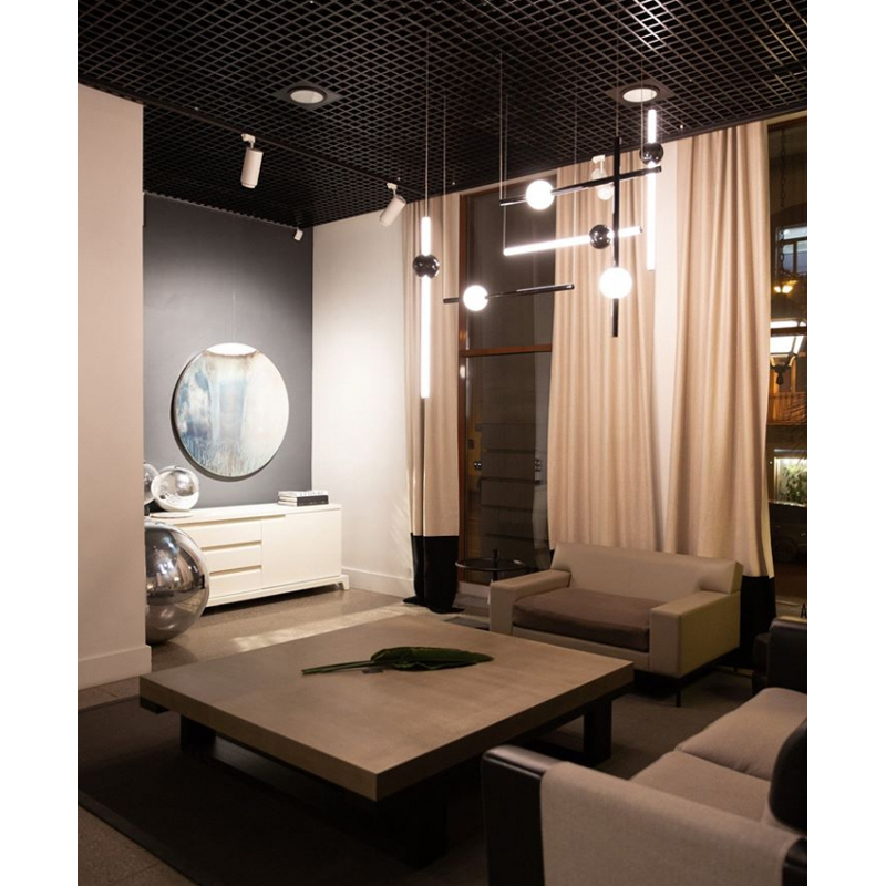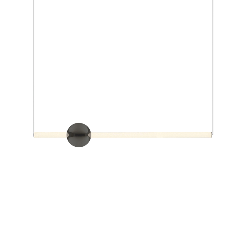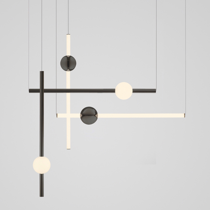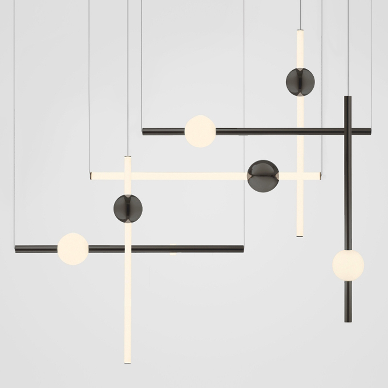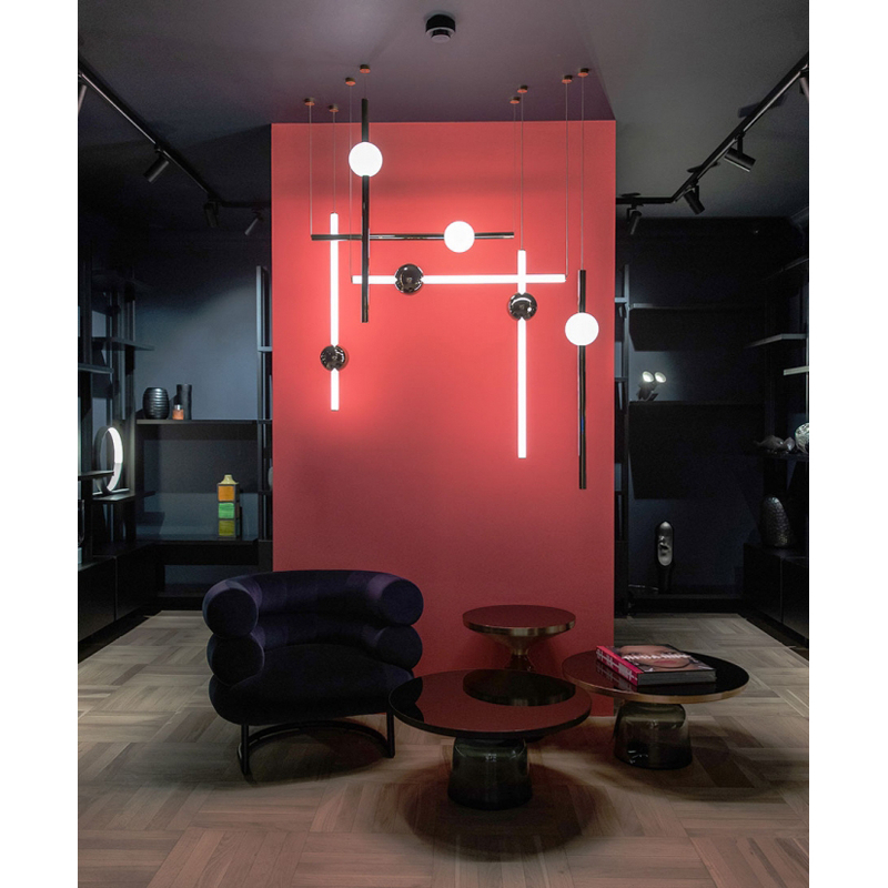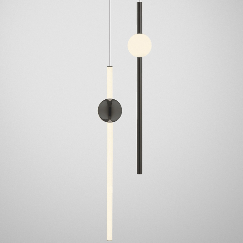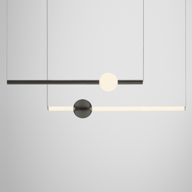 collection Orion joue sur le contraste des formes géométrique et des matières. La suspension design est disponible en deux modèles : une version est dotée d’un tube lumineux associé à un globe en acier, tandis que l’autre version comprend un tube en acier et un globe lumineux. La