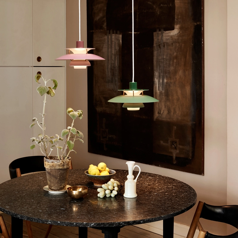 Dessinée en 1958 par Poul Henningsen pour Louis Poulsen, la suspension PH 5 tient son nom du diamètre de 50 cm de l’abat-jour principal du luminaire. À l’époque de sa création, personne ne se doutait que PH 5 finirait par incarner l’éclairage caractéristique de Poul Henningsen. La suspension se distingue par son éclairage 100 % anti-éblouissant, indépendamment de la source lumineuse employée et de la manière dont la lampe est installée. La suspension émet une lumière dirigée vers le bas et vers les côtés et s’éclaire donc elle-même. Intemporelle, PH 5 continue d'égayer les intérieurs les plus modernes grâce à sa palette de couleurs, tout comme PH 5 Mini. Cette suspension lancée en 2017 possède un abat-jour supérieur de 30 centimètres suivant les principes de Poul Henningsen. Ce premier redimensionnement de la célèbre suspension s’inscrit dans la volonté de Louis Poulsen d’accompagner la vie contemporaine et créative.
